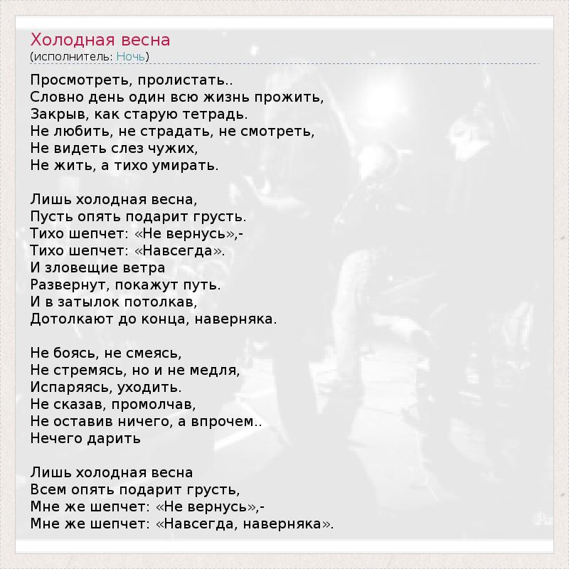 Просмотреть, пролистать.. Словно день один всю жизнь прожить, Закрыв, как старую тетрадь. Не любить, не страдать, не смотреть, Не видеть слез чужих, Не жить, а тихо умирать. Лишь холодная весна, Пусть опять подарит грусть. Тихо шепчет: «Не вернусь»,- Тихо шепчет: «Навсегда». И зловещие ветра Развернут, покажут путь. И в затылок потолкав, Дотолкают до конца, наверняка. Не боясь, не смеясь, Не стремясь, но и не медля, Испаряясь, уходить. Не сказав, промолчав, Не оставив ничего, а впрочем.. Нечего дарить Лишь холодная весна Всем опять подарит грусть, Мне же шепчет: «Не вернусь»,- Мне же шепчет: «Навсегда, наверняка».