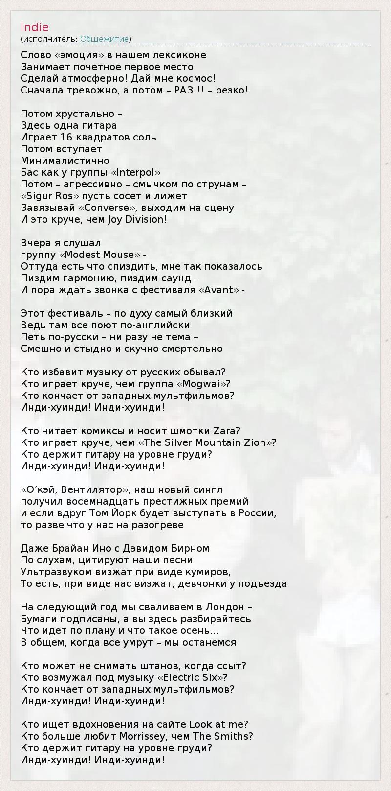 Слово «эмоция» в нашем лексиконе Занимает почетное первое место Сделай атмосферно! Дай мне космос! Сначала тревожно, а потом – РАЗ!!! – резко! Потом хрустально – Здесь одна гитара Играет 16 квадратов соль Потом вступает Минималистично Бас как у группы «Interpol» Потом – агрессивно – смычком по струнам – «Sigur Ros» пусть сосет и лижет Завязывай «Converse», выходим на сцену И это круче, чем Joy Division! Вчера я слушал группу «Modest Mouse» - Оттуда есть что спиздить, мне так показалось Пиздим гармонию, пиздим саунд – И пора ждать звонка с фестиваля «Avant» - Этот фестиваль – по духу самый близкий Ведь там все поют по-английски Петь по-русски – ни разу не тема – Смешно и стыдно и скучно смертельно Кто избавит музыку от русских обывал? Кто играет круче, чем группа «Mogwai»? Кто кончает от западных мультфильмов? Инди-хуинди! Инди-хуинди! Кто читает комиксы и носит шмотки Zara? Кто играет круче, чем «The Silver Mountain Zion»? Кто держит гитару на уровне груди? Инди-хуинди! Инди-хуинди! «О’кэй, Вентилятор», наш новый сингл получил восемнадцать престижных премий и если вдруг Том Йорк будет выступать в России, то разве что у нас на разогреве Даже Брайан Ино с Дэвидом Бирном По слухам, цитируют наши песни Ультразвуком визжат при виде кумиров, То есть, при виде нас визжат, девчонки у подъезда На следующий год мы сваливаем в Лондон – Бумаги подписаны, а вы здесь разбирайтесь Что идет по плану и что такое осень… В общем, когда все умрут – мы останемся Кто может не снимать штанов, когда ссыт? Кто возмужал под музыку «Electric Six»? Кто кончает от западных мультфильмов? Инди-хуинди! Инди-хуинди! Кто ищет вдохновения на сайте Look at me? Кто больше любит Morrissey, чем The Smiths? Кто держит гитару на уровне груди? Инди-хуинди! Инди-хуинди!