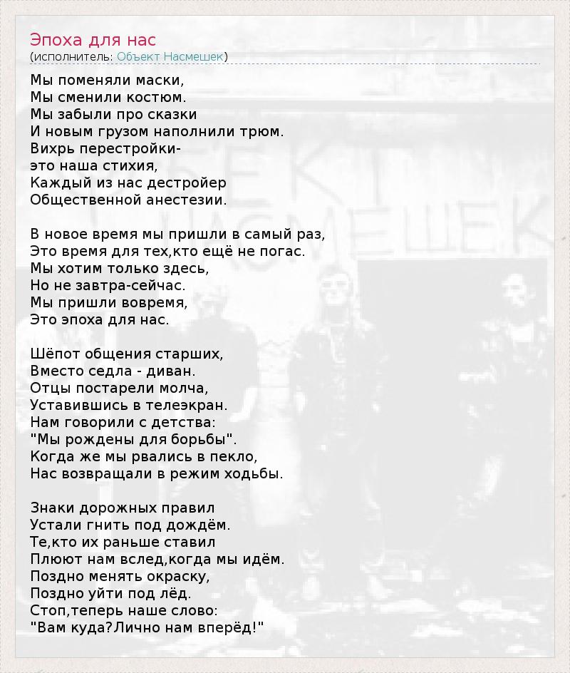 We changed the mask, We changed clothes. We forgot about the fairy tale And a new cargo hold filled. Whirlwind perestroyki- is our element, Each of us Destroyer Public anesthesia. In modern times we have come at the time, It is time for those who have not yet extinguished. All we want is here But not today, tomorrow. We arrived on time, This is an era for us. Whisper communicate seniors Instead of seat - sofa. Fathers aged silence Staring at the TV screen. We have been told since childhood: & Quot; We are born to fight & quot ;. When we rushed into the inferno, We will return to the distance. Signs of road rules Tired rot in the rain. Those who put them before Spit after us when we go. Too late to change the color, Too late to go under the ice. Whoa, now our word: & Quot; you going? Personally us forward! & Quot;