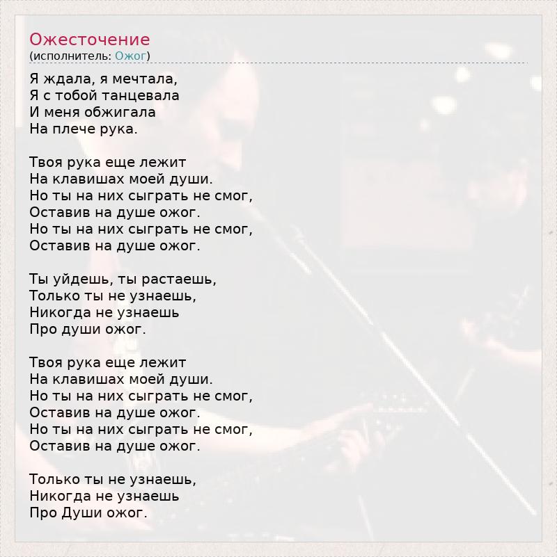 Я ждала, я мечтала, Я с тобой танцевала И меня обжигала На плече рука. Твоя рука еще лежит На клавишах моей души. Но ты на них сыграть не смог, Оставив на душе ожог. Но ты на них сыграть не смог, Оставив на душе ожог. Ты уйдешь, ты растаешь, Только ты не узнаешь, Никогда не узнаешь Про души ожог. Твоя рука еще лежит На клавишах моей души. Но ты на них сыграть не смог, Оставив на душе ожог. Но ты на них сыграть не смог, Оставив на душе ожог. Только ты не узнаешь, Никогда не узнаешь Про Души ожог.