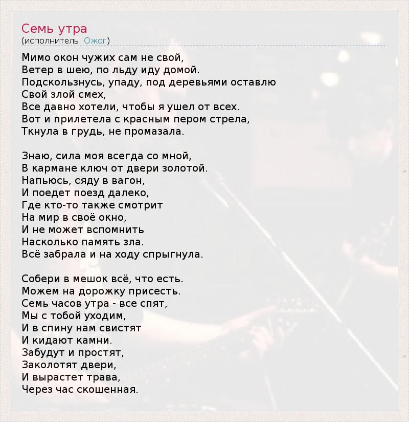 Мимо окон чужих сам не свой, Ветер в шею, по льду иду домой. Подскользнусь, упаду, под деревьями оставлю Свой злой смех, Все давно хотели, чтобы я ушел от всех. Вот и прилетела с красным пером стрела, Ткнула в грудь, не промазала. Знаю, сила моя всегда со мной, В кармане ключ от двери золотой. Напьюсь, сяду в вагон, И поедет поезд далеко, Где кто-то также смотрит На мир в своё окно, И не может вспомнить Насколько память зла. Всё забрала и на ходу спрыгнула. Собери в мешок всё, что есть. Можем на дорожку присесть. Семь часов утра - все спят, Мы с тобой уходим, И в спину нам свистят И кидают камни. Забудут и простят, Заколотят двери, И вырастет трава, Через час скошенная.