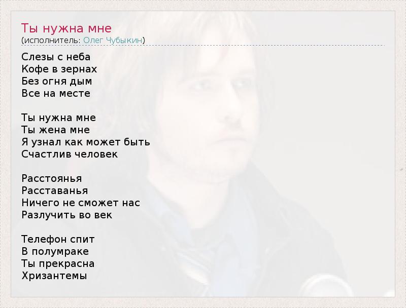 Слезы с неба Кофе в зернах Без огня дым Все на месте Ты нужна мне Ты жена мне Я узнал как может быть Счастлив человек Расстоянья Расставанья Ничего не сможет нас Разлучить во век Телефон спит В полумраке Ты прекрасна Хризантемы