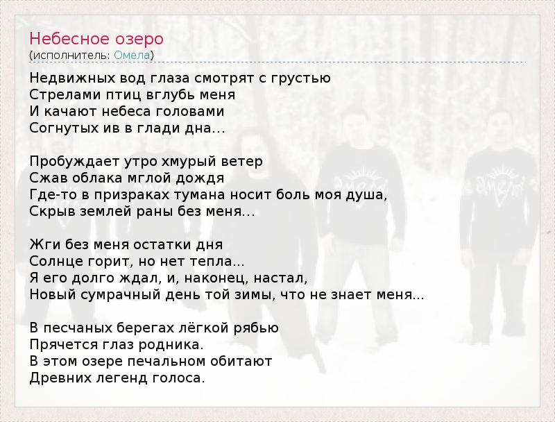 Недвижных вод глаза смотрят с грустью Стрелами птиц вглубь меня И качают небеса головами Согнутых ив в глади дна… Пробуждает утро хмурый ветер Сжав облака мглой дождя Где-то в призраках тумана носит боль моя душа, Скрыв землей раны без меня… Жги без меня остатки дня Солнце горит, но нет тепла... Я его долго ждал, и, наконец, настал, Новый сумрачный день той зимы, что не знает меня... В песчаных берегах лёгкой рябью Прячется глаз родника. В этом озере печальном обитают Древних легенд голоса.