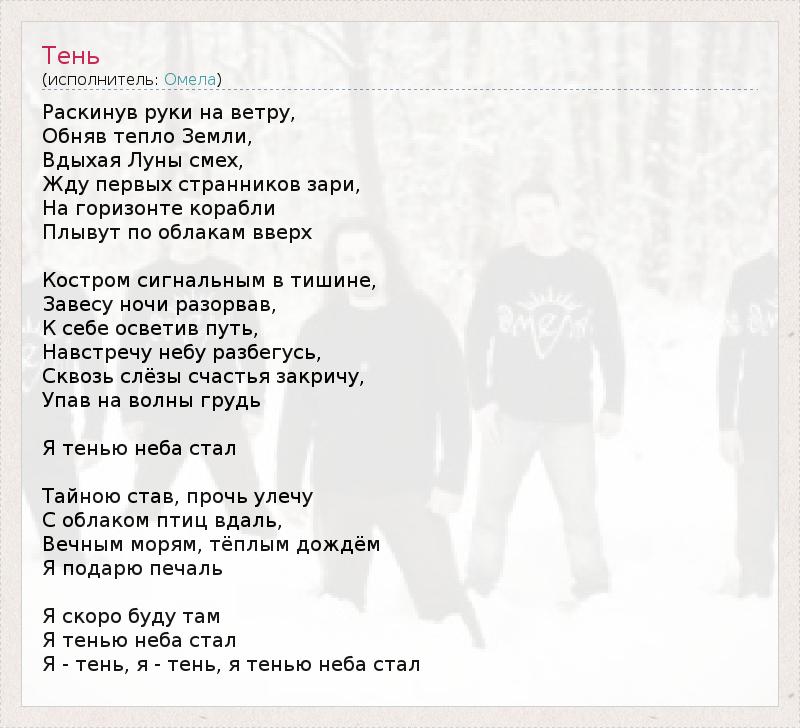 Раскинув руки на ветру, Обняв тепло Земли, Вдыхая Луны смех, Жду первых странников зари, На горизонте корабли Плывут по облакам вверх Костром сигнальным в тишине, Завесу ночи разорвав, К себе осветив путь, Навстречу небу разбегусь, Сквозь слёзы счастья закричу, Упав на волны грудь Я тенью неба стал Тайною став, прочь улечу С облаком птиц вдаль, Вечным морям, тёплым дождём Я подарю печаль Я скоро буду там Я тенью неба стал Я - тень, я - тень, я тенью неба стал