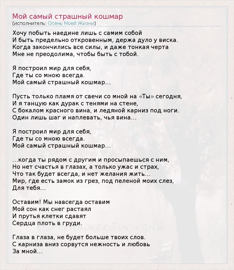 Хочу побыть наедине лишь с самим собой И быть предельно откровенным, держа дуло у виска. Когда закончились все силы, и даже тонкая черта Мне не преодолима, чтобы быть с тобой. Я построил мир для себя, Где ты со мною всегда. Мой самый страшный кошмар… Пусть только пламя от свечи со мной на «Ты» сегодня, И я танцую как дурак с тенями на стене, С бокалом красного вина, и ледяной карниз под ноги. Один лишь шаг и наплевать, чья вина… Я построил мир для себя, Где ты со мною всегда. Мой самый страшный кошмар… …когда ты рядом с другим и просыпаешься с ним, Но нет счастья в глазах, а только ужас и страх, Что так будет всегда, и нет желания жить… Мир, где есть замок из грез, под пеленой моих слез, Для тебя… Оставим! Мы навсегда оставим Мой сон как снег растаял И прутья клетки сдавят Сердца плоть в груди. Глаза в глаза, не будет больше твоих слов. С карниза вниз сорвутся нежность и любовь За мной…