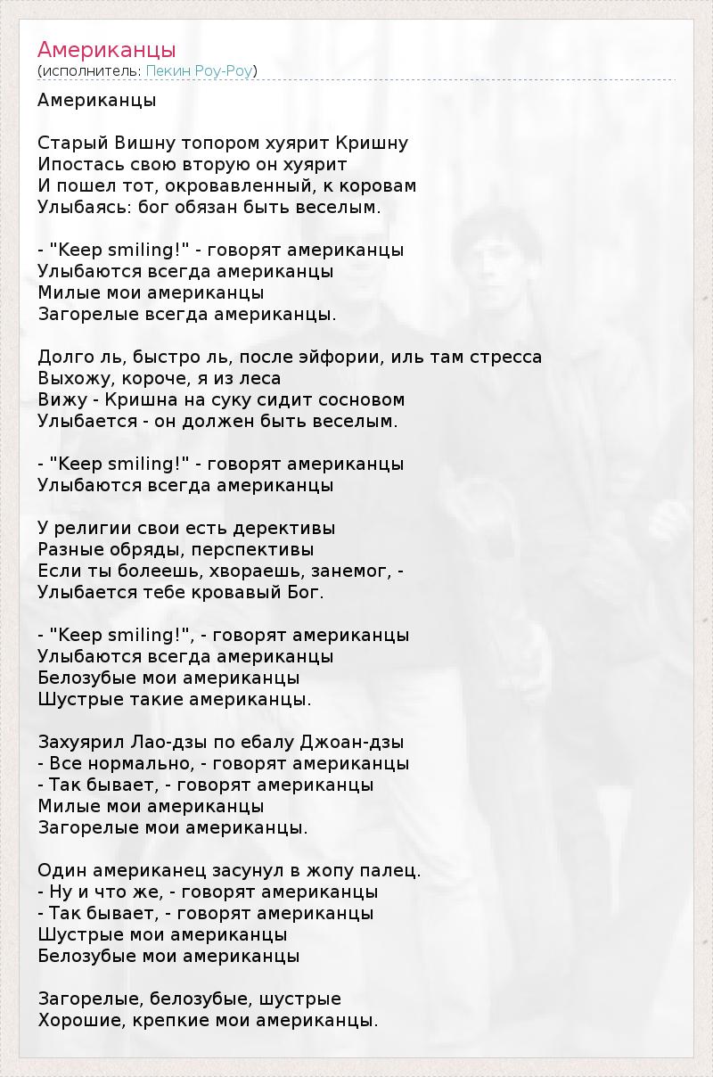 Американцы Старый Вишну топором хуярит Кришну Ипостась свою вторую он хуярит И пошел тот, окровавленный, к коровам Улыбаясь: бог обязан быть веселым. - "Keep smiling!" - говорят американцы Улыбаются всегда американцы Милые мои американцы Загорелые всегда американцы. Долго ль, быстро ль, после эйфории, иль там стресса Выхожу, короче, я из леса Вижу - Кришна на суку сидит сосновом Улыбается - он должен быть веселым. - "Keep smiling!" - говорят американцы Улыбаются всегда американцы У религии свои есть дерективы Разные обряды, перспективы Если ты болеешь, хвораешь, занемог, - Улыбается тебе кровавый Бог. - "Keep smiling!", - говорят американцы Улыбаются всегда американцы Белозубые мои американцы Шустрые такие американцы. Захуярил Лао-дзы по ебалу Джоан-дзы - Все нормально, - говорят американцы - Так бывает, - говорят американцы Милые мои американцы Загорелые мои американцы. Один американец засунул в жопу палец. - Ну и что же, - говорят американцы - Так бывает, - говорят американцы Шустрые мои американцы Белозубые мои американцы Загорелые, белозубые, шустрые Хорошие, крепкие мои американцы.