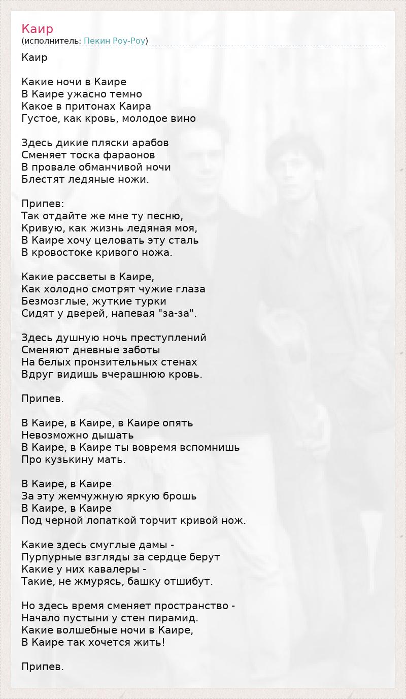 Каир Какие ночи в Каире В Каире ужасно темно Какое в притонах Каира Густое, как кровь, молодое вино Здесь дикие пляски арабов Сменяет тоска фараонов В провале обманчивой ночи Блестят ледяные ножи. Припев: Так отдайте же мне ту песню, Кривую, как жизнь ледяная моя, В Каире хочу целовать эту сталь В кровостоке кривого ножа. Какие рассветы в Каире, Как холодно смотрят чужие глаза Безмозглые, жуткие турки Сидят у дверей, напевая "за-за". Здесь душную ночь преступлений Сменяют дневные заботы На белых пронзительных стенах Вдруг видишь вчерашнюю кровь. Припев. В Каире, в Каире, в Каире опять Невозможно дышать В Каире, в Каире ты вовремя вспомнишь Про кузькину мать. В Каире, в Каире За эту жемчужную яркую брошь В Каире, в Каире Под черной лопаткой торчит кривой нож. Какие здесь смуглые дамы - Пурпурные взгляды за сердце берут Какие у них кавалеры - Такие, не жмурясь, башку отшибут. Но здесь время сменяет пространство - Начало пустыни у стен пирамид. Какие волшебные ночи в Каире, В Каире так хочется жить! Припев.