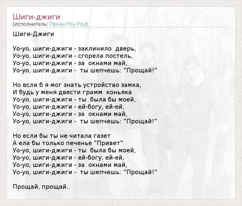 Шиги-Джиги Уо-уо, шиги-джиги - заклинило дверь, Уо-уо, шиги-джиги - сгорела постель, Уо-уо, шиги-джиги - за окнами май, Уо-уо, шиги-джиги - ты шепчешь: "Прощай!" Но если б я мог знать устройство замка, И будь у меня двести грамм коньяка Уо-уо, шиги-джиги - ты была бы моей, Уо-уо, шиги-джиги - ей-богу, ей-ей, Уо-уо, шиги-джиги - за окнами май, Уо-уо, шиги-джиги - ты шепчешь: "Прощай!" Но если бы ты не читала газет А ела бы только печенье "Привет" Уо-уо, шиги-джиги - ты была бы моей, Уо-уо, шиги-джиги - ей-богу, ей-ей, Уо-уо, шиги-джиги - за окнами май, Уо-уо, шиги-джиги - ты шепчешь: "Прощай!" Прощай, прощай..
