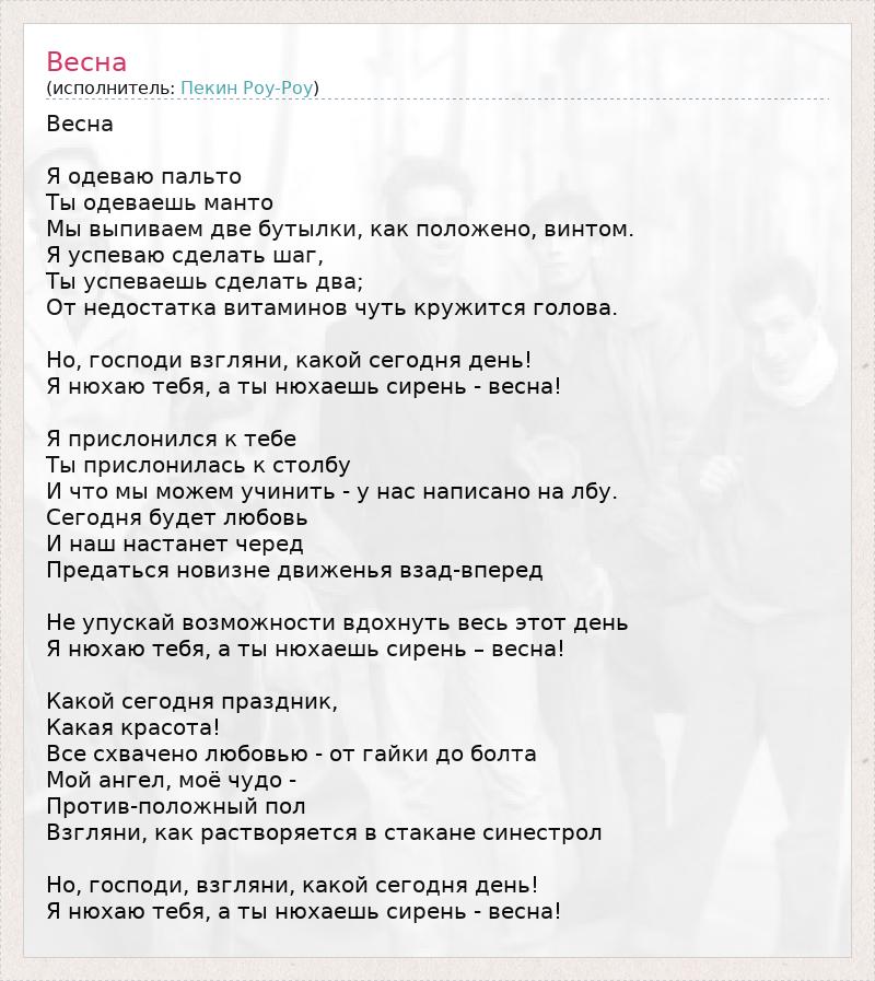 Весна Я одеваю пальто Ты одеваешь манто Мы выпиваем две бутылки, как положено, винтом. Я успеваю сделать шаг, Ты успеваешь сделать два; От недостатка витаминов чуть кружится голова. Но, господи взгляни, какой сегодня день! Я нюхаю тебя, а ты нюхаешь сирень - весна! Я прислонился к тебе Ты прислонилась к столбу И что мы можем учинить - у нас написано на лбу. Сегодня будет любовь И наш настанет черед Предаться новизне движенья взад-вперед Не упускай возможности вдохнуть весь этот день Я нюхаю тебя, а ты нюхаешь сирень – весна! Какой сегодня праздник, Какая красота! Все схвачено любовью - от гайки до болта Мой ангел, моё чудо - Против-положный пол Взгляни, как растворяется в стакане синестрол Но, господи, взгляни, какой сегодня день! Я нюхаю тебя, а ты нюхаешь сирень - весна!