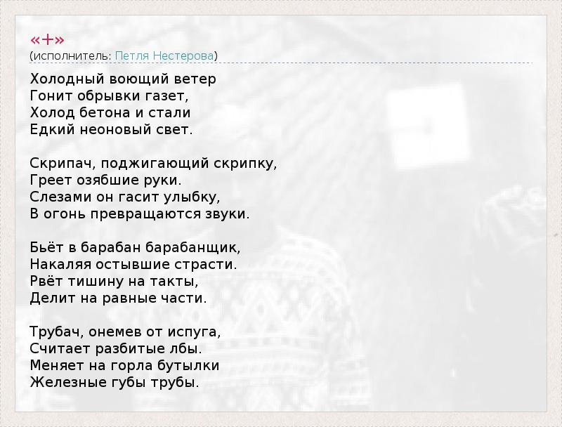 Холодный воющий ветер Гонит обрывки газет, Холод бетона и стали Едкий неоновый свет. Скрипач, поджигающий скрипку, Греет озябшие руки. Слезами он гасит улыбку, В огонь превращаются звуки. Бьёт в барабан барабанщик, Накаляя остывшие страсти. Рвёт тишину на такты, Делит на равные части. Трубач, онемев от испуга, Считает разбитые лбы. Меняет на горла бутылки Железные губы трубы.