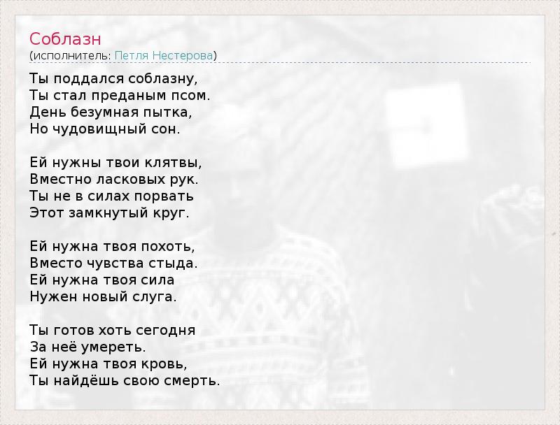 Ты поддался соблазну, Ты стал преданым псом. День безумная пытка, Но чудовищный сон. Ей нужны твои клятвы, Вместно ласковых рук. Ты не в силах порвать Этот замкнутый круг. Ей нужна твоя похоть, Вместо чувства стыда. Ей нужна твоя сила Нужен новый слуга. Ты готов хоть сегодня За неё умереть. Ей нужна твоя кровь, Ты найдёшь свою смерть.