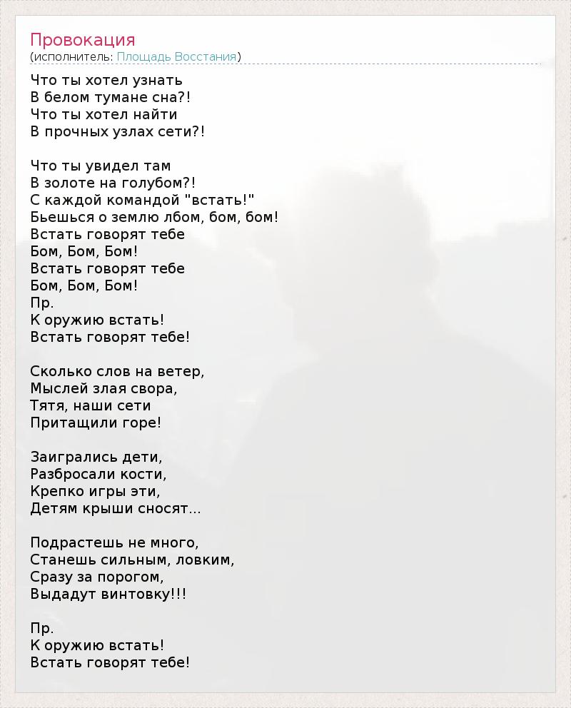 Что ты хотел узнать В белом тумане сна?! Что ты хотел найти В прочных узлах сети?! Что ты увидел там В золоте на голубом?! С каждой командой "встать!" Бьешься о землю лбом, бом, бом! Встать говорят тебе Бом, Бом, Бом! Встать говорят тебе Бом, Бом, Бом! Пр. К оружию встать! Встать говорят тебе! Сколько слов на ветер, Мыслей злая свора, Тятя, наши сети Притащили горе! Заигрались дети, Разбросали кости, Крепко игры эти, Детям крыши сносят... Подрастешь не много, Станешь сильным, ловким, Сразу за порогом, Выдадут винтовку!!! Пр. К оружию встать! Встать говорят тебе!