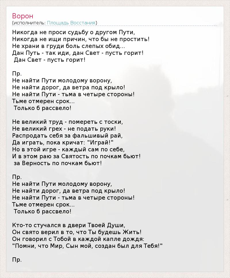 Никогда не проси судьбу о другом Пути, Никогда не ищи причин, что бы не простить! Не храни в груди боль слепых обид... Дан Путь - так иди, дан Свет - пусть горит! Дан Свет - пусть горит! Пр. Не найти Пути молодому ворону, Не найти дорог, да ветра под крыло! Не найти Пути - тьма в четыре стороны! Тьме отмерен срок... Только б рассвело! Не великий труд - помереть с тоски, Не великий грех - не подать руки! Распродать себя за фальшивый рай, Да играть, пока кричат: "Играй!" Но в этой игре - каждый сам по себе, И в этом раю за Святость по почкам бьют! за Верность по почкам бьют! Пр. Не найти Пути молодому ворону, Не найти дорог, да ветра под крыло! Не найти Пути - тьма в четыре стороны! Тьме отмерен срок... Только б рассвело! Кто-то стучался в двери Твоей Души, Он свято верил в то, что Ты будешь Жить! Он говорил с Тобой в каждой капле дождя: "Помни, что Мир, Сын мой, создан был для Тебя!" Пр.