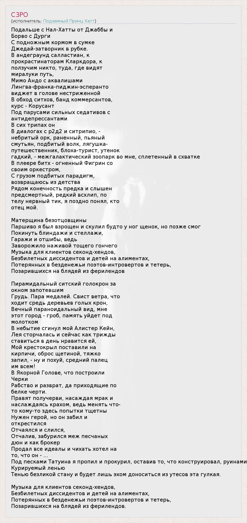 Подальше с Нал-Хатты от Джаббы и Борво с Дурги С подножным кормом в сумке Джедай-затворник в рубке. В андеграунд салластиан, к прокрастинаторам Кларкдора, к ползучим никто, туда, где видят миралуки путь, Мимо Андо с аквалишами Лингва-франка-пиджин-эсперанто виджет в голове нестриженной В обход ситхов, банд коммерсантов, курс - Корусант Под парусами сильных седативов с антидепрессантами В сих трипах он В диалогах с р2д2 и ситрипио, - небритый орк, раненный, пьяный смутьян, подбитый волк, лягушка- путешественник, блоха-турист, утенок гадкий, - межгалактический зоопарк во мне, сплетенный в схватке В плеере битх - огненный Фигрин со своим оркестром, С грузом подбитых парадигм, возвращаюсь из детства Рядом конечность предка и слышен предсмертный, редкий всхлип, по телу нервный тик, я поздно понял, кто отец мой. Матерщина безотцовщины Паршиво я был взрощен и скулил будто у ног щенок, но позже смог Покинуть блиндажи и стеллажи, Гаражи и отшибы, ведь Заворожило наживой тощего гончего Музыка для клиентов секонд-хендов, Безбилетных диссидентов и детей на алиментах, Потерянных в безденежьи поэтов-интровертов и тетерь, Позарившихся на блядей из ферилендов Пирамидальный ситский голокрон за окном запотевшим Грудь. Пара медалей. Свист ветра, что ходит средь деревьев голых крон, Вечный параноидальный вид, мне этот город - гроб, память уйдет под молотком В небытие сгинул мой Алистер Кейн, Лея сторчалась и сейчас как трижды ставиться в день нравится ей, Мой крестокрыл поставили на кирпичи, оброс щетиной, тяжко запил, - ну и похуй, средний палец им всем! В Якорной Голове, что построили Черки Рабство и разврат, да приходящие по белке черти. Правят получерви, насаждая мрак и наслаждаясь крахом, ведь менять что- то кому-то здесь попытки тщетны Нужен герой, но он забил и открестился Отчаялся и слился, Отчалив, забурился меж песчаных дюн и как брокер Продал все идеалы и чихать хотел на то, что он - ... Под песками Татуина я пропил и прокурил, оставив то, что конструировал, руинами Курируемый ленью Тенью безликой стану и будет лишь эхом доноситься из утесов эта гулкая. Музыка для клиентов секонд-хендов, Безбилетных диссидентов и детей на алиментах, Потерянных в безденежьи поэтов-интровертов и тетерь, Позарившихся на блядей из ферилендов.