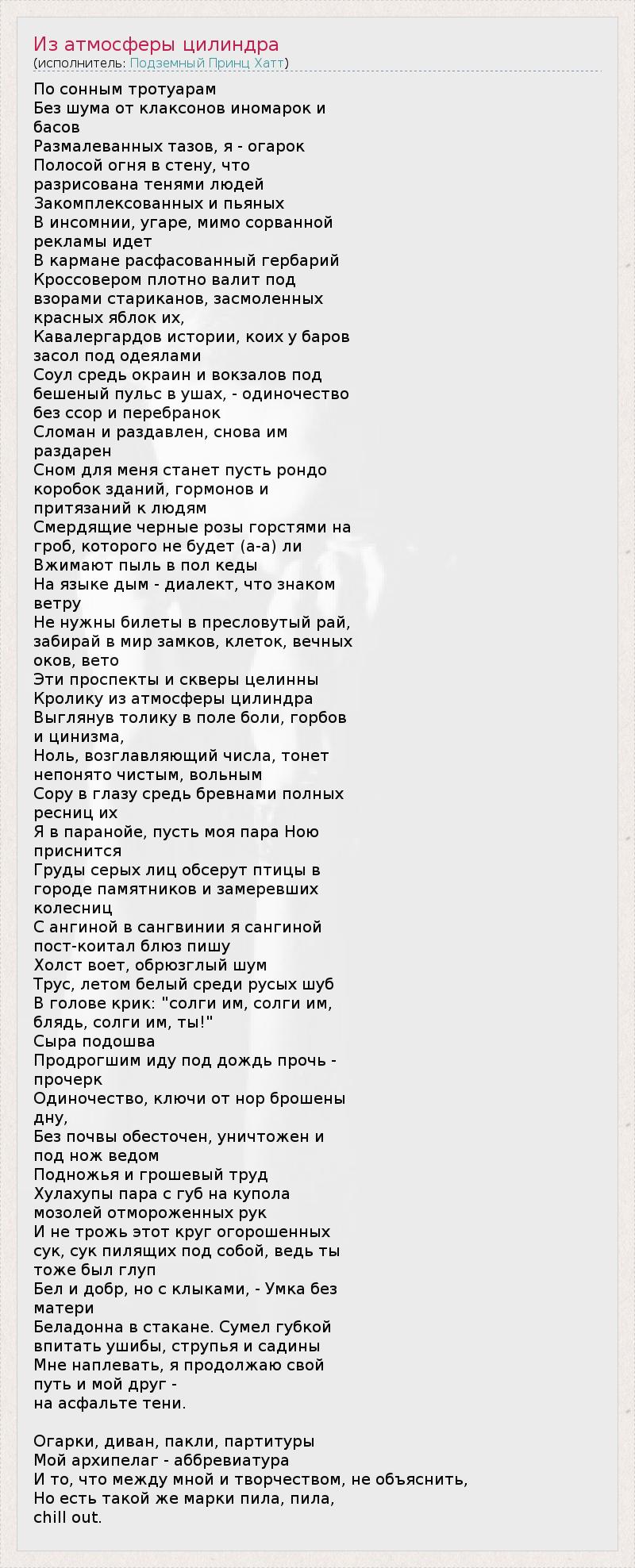 In sleepy sidewalks No noise from the cars and horns Bass Daubed cans, I - candle Stripe fire wall that Painted shadows of people And notorious drunk In insomnia, intoxication, torn by Advertising is In the bag packed herbarium Crossover brings down tightly under starikanov gaze, zasmolennyh their red apples, Cavalier history of which have bars salting under blankets Soul broad margins and stations under frantic pulse in my ears - loneliness without quarrels and bickering Broken and crushed it again give away A dream for me would be let Rondo boxes buildings, hormones, and claims to the people Filthy black roses on a handful coffin, which would not be (aa) whether the Presses the dust on the floor sneakers In the language of the smoke - a dialect of that sign wind We do not need tickets to the proverbial paradise Take the world of castles, cells eternal shackles, veto These avenues and squares of virgin Rabbit from the air cylinder Looking out at a fraction of the field of pain, humps and cynicism, Zero, head of sinks misunderstood pure freestyle Copy in the eye amid the full logs their eyelashes I'm paranoid, let my pair of Noah dream Piles of gray persons obserut poultry city monuments and zamerevshih chariots With angina in Sanguinius I sanguine post-koital blues writing Canvas howls flabby noise Coward, summer among white blond fur In my head shouting: & quot; lie to them, lie to them, damn, they lie to you! & quot; Cheese sole Shivering in the rain go away - dash Loneliness, the keys to the abandoned burrows bottom, No soil is de-energized, and destroyed guided under the knife The foot and Groshev work Hulahupy couple with the lips in the dome corns frostbitten hands And do not touch the circle blindsided bitches, bitches under a Peel, you're It was also stupid Bel and kind, but with fangs - Umka without mother Belladonna in a glass. Managed sponge soak up the bruises, scabs and Sardinia I do not care, I continue my path and my friend - shadows on the pavement. Cinders, sofa, tow Scores My archipelago - an acronym And the fact that between me and creativity, can not be explained, But there are a brand Saw Saw chill out.