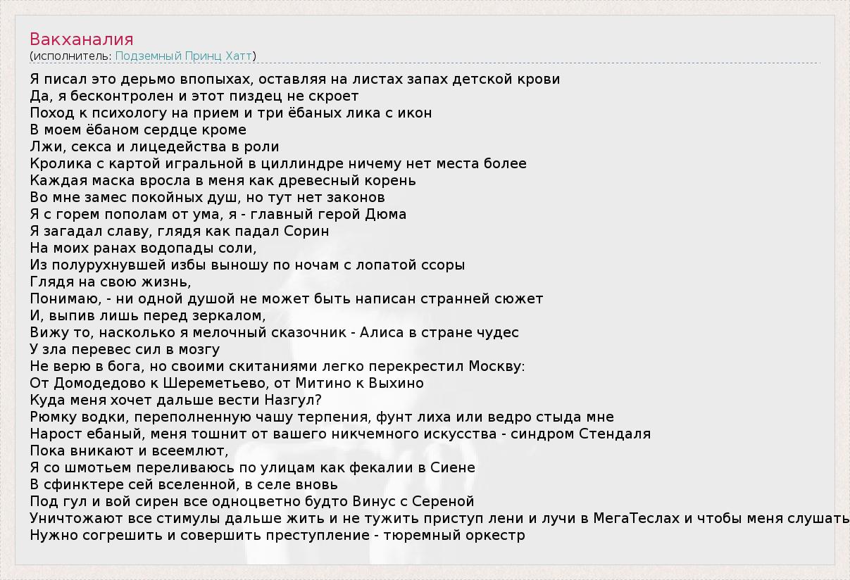 Я писал это дерьмо впопыхах, оставляя на листах запах детской крови Да, я бесконтролен и этот пиздец не скроет Поход к психологу на прием и три ёбаных лика с икон В моем ёбаном сердце кроме Лжи, секса и лицедейства в роли Кролика с картой игральной в циллиндре ничему нет места более Каждая маска вросла в меня как древесный корень Во мне замес покойных душ, но тут нет законов Я с горем пополам от ума, я - главный герой Дюма Я загадал славу, глядя как падал Сорин На моих ранах водопады соли, Из полурухнувшей избы выношу по ночам с лопатой ссоры Глядя на свою жизнь, Понимаю, - ни одной душой не может быть написан странней сюжет И, выпив лишь перед зеркалом, Вижу то, насколько я мелочный сказочник - Алиса в стране чудес У зла перевес сил в мозгу Не верю в бога, но своими скитаниями легко перекрестил Москву: От Домодедово к Шереметьево, от Митино к Выхино Куда меня хочет дальше вести Назгул? Рюмку водки, переполненную чашу терпения, фунт лиха или ведро стыда мне Нарост ебаный, меня тошнит от вашего никчемного искусства - синдром Стендаля Пока вникают и всеемлют, Я со шмотьем переливаюсь по улицам как фекалии в Сиене В сфинктере сей вселенной, в селе вновь Под гул и вой сирен все одноцветно будто Винус с Сереной Уничтожают все стимулы дальше жить и не тужить приступ лени и лучи в МегаТеслах и чтобы меня слушать Нужно согрешить и совершить преступление - тюремный оркестр