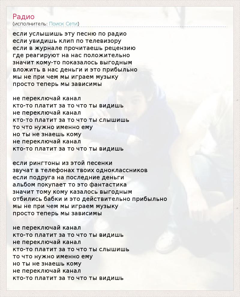 если услышишь эту песню по радио если увидишь клип по телевизору если в журнале прочитаешь рецензию где реагируют на нас положительно значит кому-то показалось выгодным вложить в нас деньги и это прибыльно мы не при чем мы играем музыку просто теперь мы зависимы не переключай канал кто-то платит за то что ты видишь не переключай канал кто-то платит за то что ты слышишь то что нужно именно ему но ты не знаешь кому не переключай канал кто-то платит за то что ты видишь если рингтоны из этой песенки звучат в телефонах твоих одноклассников если подруга на последние деньги альбом покупает то это фантастика значит тому кому казалось выгодным отбились бабки и это действительно прибыльно мы не при чем мы играем музыку просто теперь мы зависимы не переключай канал кто-то платит за то что ты видишь не переключай канал кто-то платит за то что ты слышишь то что нужно именно ему но ты не знаешь кому не переключай канал кто-то платит за то что ты видишь