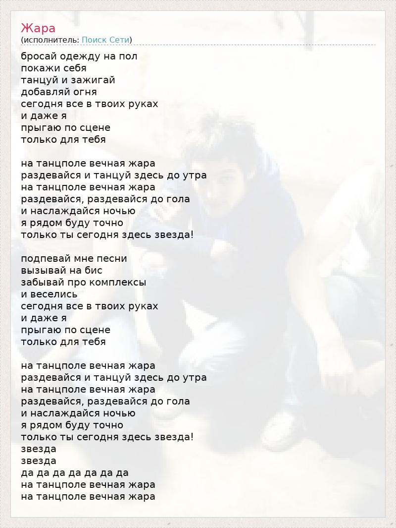 бросай одежду на пол покажи себя танцуй и зажигай добавляй огня сегодня все в твоих руках и даже я прыгаю по сцене только для тебя на танцполе вечная жара раздевайся и танцуй здесь до утра на танцполе вечная жара раздевайся, раздевайся до гола и наслаждайся ночью я рядом буду точно только ты сегодня здесь звезда! подпевай мне песни вызывай на бис забывай про комплексы и веселись сегодня все в твоих руках и даже я прыгаю по сцене только для тебя на танцполе вечная жара раздевайся и танцуй здесь до утра на танцполе вечная жара раздевайся, раздевайся до гола и наслаждайся ночью я рядом буду точно только ты сегодня здесь звезда! звезда звезда да да да да да да да на танцполе вечная жара на танцполе вечная жара