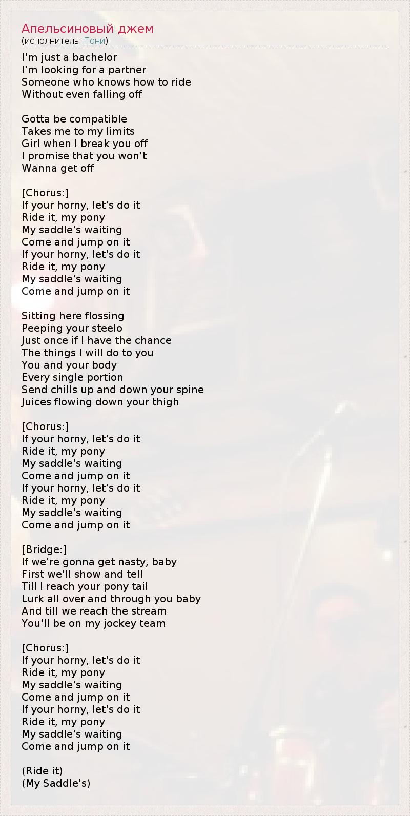 I'm just a bachelor I'm looking for a partner Someone who knows how to ride Without even falling off Gotta be compatible Takes me to my limits Girl when I break you off I promise that you won't Wanna get off [Chorus:] If your horny, let's do it Ride it, my pony My saddle's waiting Come and jump on it If your horny, let's do it Ride it, my pony My saddle's waiting Come and jump on it Sitting here flossing Peeping your steelo Just once if I have the chance The things I will do to you You and your body Every single portion Send chills up and down your spine Juices flowing down your thigh [Chorus:] If your horny, let's do it Ride it, my pony My saddle's waiting Come and jump on it If your horny, let's do it Ride it, my pony My saddle's waiting Come and jump on it [Bridge:] If we're gonna get nasty, baby First we'll show and tell Till I reach your pony tail Lurk all over and through you baby And till we reach the stream You'll be on my jockey team [Chorus:] If your horny, let's do it Ride it, my pony My saddle's waiting Come and jump on it If your horny, let's do it Ride it, my pony My saddle's waiting Come and jump on it (Ride it) (My Saddle's)