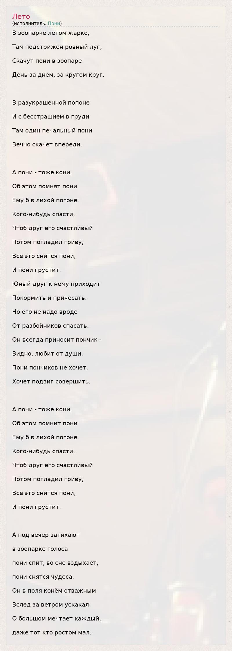В зоопарке летом жарко, Там подстрижен ровный луг, Скачут пони в зоопаре День за днем, за кругом круг. В разукрашенной попоне И с бесстрашием в груди Там один печальный пони Вечно скачет впереди. А пони - тоже кони, Об этом помнят пони Ему б в лихой погоне Кого-нибудь спасти, Чтоб друг его счастливый Потом погладил гриву, Все это снится пони, И пони грустит. Юный друг к нему приходит Покормить и причесать. Но его не надо вроде От разбойников спасать. Он всегда приносит пончик - Видно, любит от души. Пони пончиков не хочет, Хочет подвиг совершить. А пони - тоже кони, Об этом помнит пони Ему б в лихой погоне Кого-нибудь спасти, Чтоб друг его счастливый Потом погладил гриву, Все это снится пони, И пони грустит. А под вечер затихают в зоопарке голоса пони спит, во сне вздыхает, пони снятся чудеса. Он в поля конём отважным Вслед за ветром ускакал. О большом мечтает каждый, даже тот кто ростом мал.