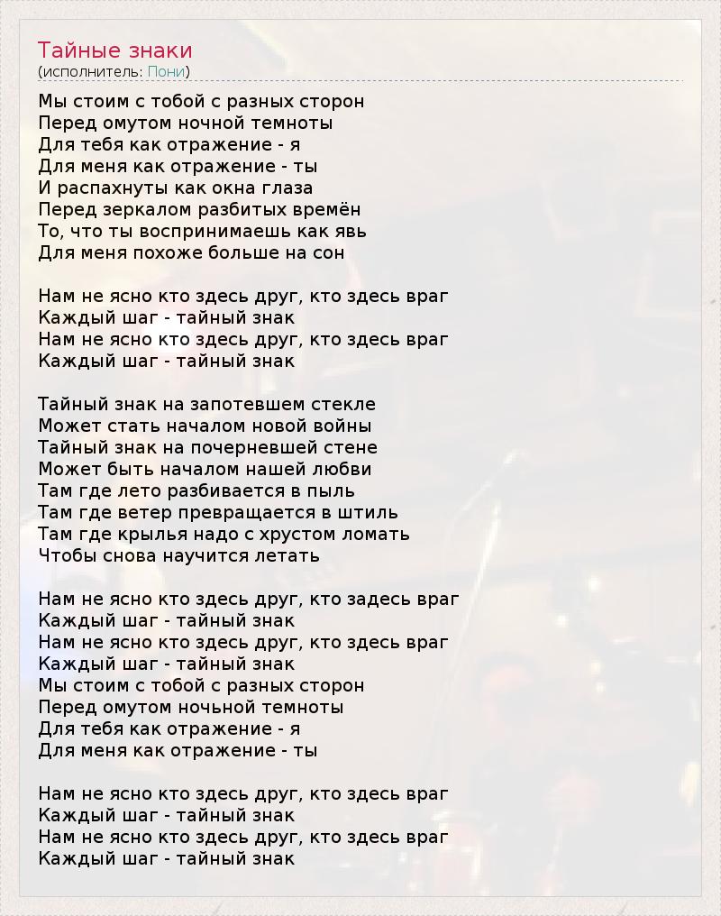 Мы стоим с тобой с разных сторон Перед омутом ночной темноты Для тебя как отражение - я Для меня как отражение - ты И распахнуты как окна глаза Перед зеркалом разбитых времён То, что ты воспринимаешь как явь Для меня похоже больше на сон Нам не ясно кто здесь друг, кто здесь враг Каждый шаг - тайный знак Нам не ясно кто здесь друг, кто здесь враг Каждый шаг - тайный знак Тайный знак на запотевшем стекле Может стать началом новой войны Тайный знак на почерневшей стене Может быть началом нашей любви Там где лето разбивается в пыль Там где ветер превращается в штиль Там где крылья надо с хрустом ломать Чтобы снова научится летать Нам не ясно кто здесь друг, кто задесь враг Каждый шаг - тайный знак Нам не ясно кто здесь друг, кто здесь враг Каждый шаг - тайный знак Мы стоим с тобой с разных сторон Перед омутом ночьной темноты Для тебя как отражение - я Для меня как отражение - ты Нам не ясно кто здесь друг, кто здесь враг Каждый шаг - тайный знак Нам не ясно кто здесь друг, кто здесь враг Каждый шаг - тайный знак