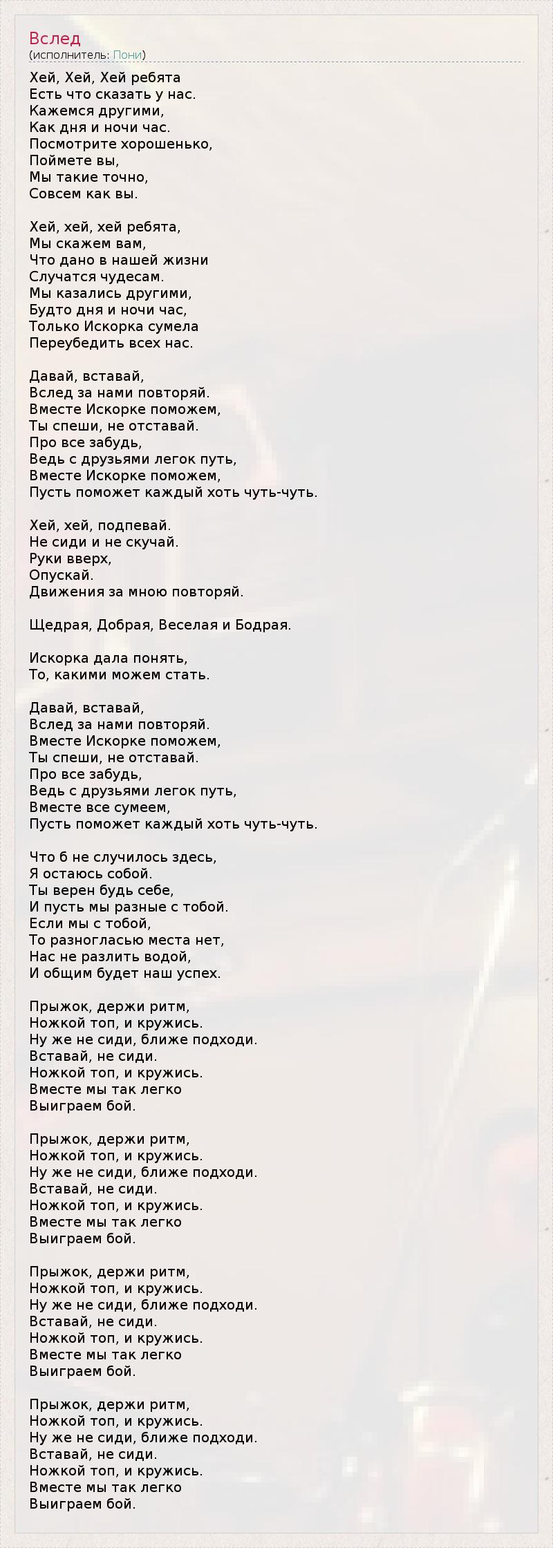 Хей, Хей, Хей ребята Есть что сказать у нас. Кажемся другими, Как дня и ночи час. Посмотрите хорошенько, Поймете вы, Мы такие точно, Совсем как вы. Хей, хей, хей ребята, Мы скажем вам, Что дано в нашей жизни Случатся чудесам. Мы казались другими, Будто дня и ночи час, Только Искорка сумела Переубедить всех нас. Давай, вставай, Вслед за нами повторяй. Вместе Искорке поможем, Ты спеши, не отставай. Про все забудь, Ведь с друзьями легок путь, Вместе Искорке поможем, Пусть поможет каждый хоть чуть-чуть. Хей, хей, подпевай. Не сиди и не скучай. Руки вверх, Опускай. Движения за мною повторяй. Щедрая, Добрая, Веселая и Бодрая. Искорка дала понять, То, какими можем стать. Давай, вставай, Вслед за нами повторяй. Вместе Искорке поможем, Ты спеши, не отставай. Про все забудь, Ведь с друзьями легок путь, Вместе все сумеем, Пусть поможет каждый хоть чуть-чуть. Что б не случилось здесь, Я остаюсь собой. Ты верен будь себе, И пусть мы разные с тобой. Если мы с тобой, То разногласью места нет, Нас не разлить водой, И общим будет наш успех. Прыжок, держи ритм, Ножкой топ, и кружись. Ну же не сиди, ближе подходи. Вставай, не сиди. Ножкой топ, и кружись. Вместе мы так легко Выиграем бой. Прыжок, держи ритм, Ножкой топ, и кружись. Ну же не сиди, ближе подходи. Вставай, не сиди. Ножкой топ, и кружись. Вместе мы так легко Выиграем бой. Прыжок, держи ритм, Ножкой топ, и кружись. Ну же не сиди, ближе подходи. Вставай, не сиди. Ножкой топ, и кружись. Вместе мы так легко Выиграем бой. Прыжок, держи ритм, Ножкой топ, и кружись. Ну же не сиди, ближе подходи. Вставай, не сиди. Ножкой топ, и кружись. Вместе мы так легко Выиграем бой.