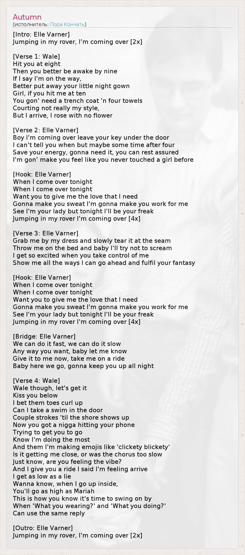 [Вступление: Elle Varner] Я запрыгиваю в свой Ровер, 1 я уже еду. [2x] [1 куплет: Wale] Я буду у тебя в восемь, Так что лучше просыпайся к девяти. Если я говорю, что уже еду, Лучше снимай свой маленький пеньюар. Девочка, если ты приедешь к десяти, Тебе понадобятся плащ и четыре полотенца. Ухаживания – не в моём стиле, Но когда я приезжаю, я роза, только не цветок. [2 куплет: Elle Varner] Парень, я уже еду, оставь свой ключ под дверью. Я не могу сказать, во сколько, но, может, после четырех. Копи энергию, она тебе понадобится, ты точно отдохнёшь. Со мной тебе покажется, что ты ещё не знал женщин. [Хук: Elle Varner] Когда я приеду сегодня ночью, Когда я приеду сегодня ночью, Я хочу, чтобы ты отдал мне всю любовь, которую я хочу получить. Я заставлю тебя попотеть, я заставлю тебя поработать для меня. Знай: я твоя женщина, но этой ночью я буду твоей сумасшедшей. Я запрыгиваю в свой Ровер, я уже еду. [4x] [3 куплет: Elle Varner] Возьми меня за платье и медленно разорви его по шву. Брось меня на постель – я постараюсь не кричать, малыш. Я так завожусь, когда ты овладеваешь мной. Покажи мне, что мне можно делать, воплоти свои фантазии. [Хук: Elle Varner] Когда я приеду сегодня ночью, Когда я приеду сегодня ночью, Я хочу, чтобы ты отдал мне всю любовь, которую я хочу получить. Я заставлю тебя попотеть, я заставлю тебя поработать для меня. Знай: я твоя женщина, но этой ночью я буду твоей сумасшедшей. Я запрыгиваю в свой Ровер, я уже еду. [4x] [Переход: Elle Varner] Мы можем делать это быстро, мы можем делать это медленно – Как ты захочешь, малыш, только скажи. Дай же мне это, насади меня. Вперёд, малыш, я не дам тебе заснуть всю ночь. [4 куплет: Wale] Давай, Wale, сделай это! Я целую тебя внизу. Спорим, ты будешь поджимать пальцы? Можно я нырну в твою дверь, Сделаю пару гребков, 2 пока не покажется берег? Теперь ниггер обрывает твой телефон, Стараясь затащить тебя к себе. Ты знаешь, я делаю всё, что могу. Я посылаю тебе эмодзи: клик-клик-клик, без остановки. Это делает меня ближе. Или припев был слишком медленным? Ты чувствуешь эти флюиды? Я насаживаю тебя, я чувствую, что скоро приплыву. Я опустился ниже некуда. Если хочешь знать, когда я войду в тебя, Ты заверещишь, как Мэрайа. 3 А теперь, как понимаешь, пора кончать. Это тот случай, когда вопросы "Что на тебе?" и "Кто на тебе?" Предполагают один ответ. [Окончание: Elle Varner] Я запрыгиваю в свой Ровер, я уже еду. [2x] 1 – Ровер – сокращение от Лэнд Ровер – автомобиль-внедорожник. 2 – Обыгрывается плавание и секс: stroke – "грести" и одновременно "поглаживать", "ласкать". 3 – Мэрайя Кэри – американская певица и актриса.