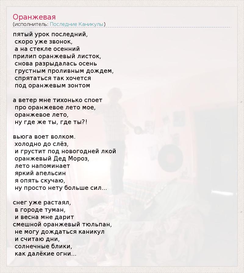 пятый урок последний, скоро уже звонок, а на стекле осенний прилип оранжевый листок, снова разрыдалась осень грустным проливным дождем, спрятаться так хочется под оранжевым зонтом а ветер мне тихонько споет про оранжевое лето мое, оранжевое лето, ну где же ты, где ты?! вьюга воет волком. холодно до слёз, и грустит под новогодней лкой оранжевый Дед Мороз, лето напоминает яркий апельсин я опять скучаю, ну просто нету больше сил... снег уже растаял, в городе туман, и весна мне дарит смешной оранжевый тюльпан, не могу дождаться каникул и считаю дни, солнечные блики, как далёкие огни...