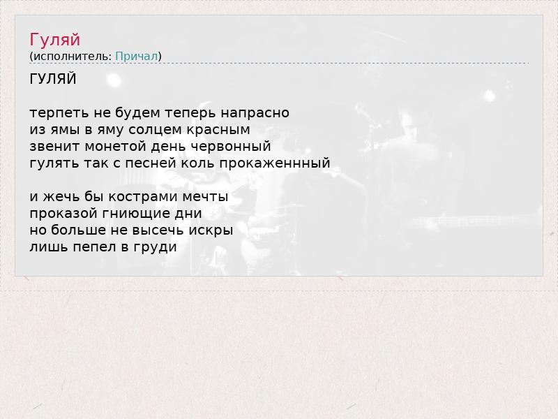 ГУЛЯЙ терпеть не будем теперь напрасно из ямы в яму солцем красным звенит монетой день червонный гулять так с песней коль прокаженнный и жечь бы кострами мечты проказой гниющие дни но больше не высечь искры лишь пепел в груди