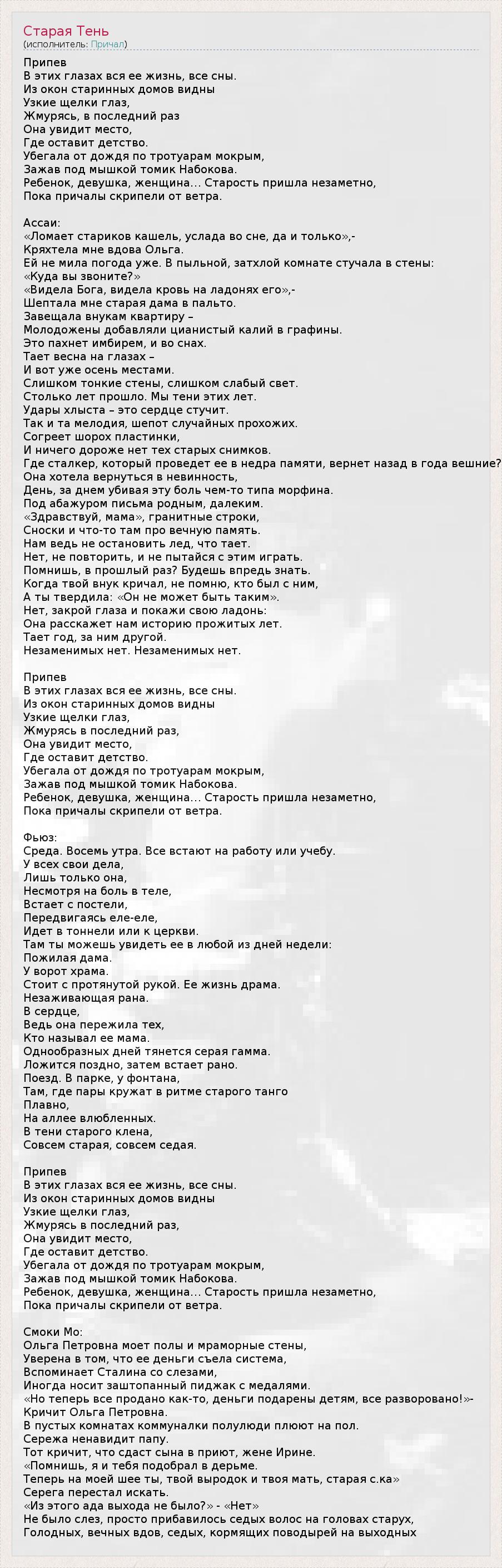 Припев В этих глазах вся ее жизнь, все сны. Из окон старинных домов видны Узкие щелки глаз, Жмурясь, в последний раз Она увидит место, Где оставит детство. Убегала от дождя по тротуарам мокрым, Зажав под мышкой томик Набокова. Ребенок, девушка, женщина… Старость пришла незаметно, Пока причалы скрипели от ветра. Ассаи: «Ломает стариков кашель, услада во сне, да и только»,- Кряхтела мне вдова Ольга. Ей не мила погода уже. В пыльной, затхлой комнате стучала в стены: «Куда вы звоните?» «Видела Бога, видела кровь на ладонях его»,- Шептала мне старая дама в пальто. Завещала внукам квартиру – Молодожены добавляли цианистый калий в графины. Это пахнет имбирем, и во снах. Тает весна на глазах – И вот уже осень местами. Слишком тонкие стены, слишком слабый свет. Столько лет прошло. Мы тени этих лет. Удары хлыста – это сердце стучит. Так и та мелодия, шепот случайных прохожих. Согреет шорох пластинки, И ничего дороже нет тех старых снимков. Где сталкер, который проведет ее в недра памяти, вернет назад в года вешние? Она хотела вернуться в невинность, День, за днем убивая эту боль чем-то типа морфина. Под абажуром письма родным, далеким. «Здравствуй, мама», гранитные строки, Сноски и что-то там про вечную память. Нам ведь не остановить лед, что тает. Нет, не повторить, и не пытайся с этим играть. Помнишь, в прошлый раз? Будешь впредь знать. Когда твой внук кричал, не помню, кто был с ним, А ты твердила: «Он не может быть таким». Нет, закрой глаза и покажи свою ладонь: Она расскажет нам историю прожитых лет. Тает год, за ним другой. Незаменимых нет. Незаменимых нет. Припев В этих глазах вся ее жизнь, все сны. Из окон старинных домов видны Узкие щелки глаз, Жмурясь в последний раз, Она увидит место, Где оставит детство. Убегала от дождя по тротуарам мокрым, Зажав под мышкой томик Набокова. Ребенок, девушка, женщина… Старость пришла незаметно, Пока причалы скрипели от ветра. Фьюз: Среда. Восемь утра. Все встают на работу или учебу. У всех свои дела, Лишь только она, Несмотря на боль в теле, Встает с постели, Передвигаясь еле-еле, Идет в тоннели или к церкви. Там ты можешь увидеть ее в любой из дней недели: Пожилая дама. У ворот храма. Стоит с протянутой рукой. Ее жизнь драма. Незаживающая рана. В сердце, Ведь она пережила тех, Кто называл ее мама. Однообразных дней тянется серая гамма. Ложится поздно, затем встает рано. Поезд. В парке, у фонтана, Там, где пары кружат в ритме старого танго Плавно, На аллее влюбленных. В тени старого клена, Совсем старая, совсем седая. Припев В этих глазах вся ее жизнь, все сны. Из окон старинных домов видны Узкие щелки глаз, Жмурясь в последний раз, Она увидит место, Где оставит детство. Убегала от дождя по тротуарам мокрым, Зажав под мышкой томик Набокова. Ребенок, девушка, женщина… Старость пришла незаметно, Пока причалы скрипели от ветра. Смоки Мо: Ольга Петровна моет полы и мраморные стены, Уверена в том, что ее деньги съела система, Вспоминает Сталина со слезами, Иногда носит заштопанный пиджак с медалями. «Но теперь все продано как-то, деньги подарены детям, все разворовано!»- Кричит Ольга Петровна. В пустых комнатах коммуналки полулюди плюют на пол. Сережа ненавидит папу. Тот кричит, что сдаст сына в приют, жене Ирине. «Помнишь, я и тебя подобрал в дерьме. Теперь на моей шее ты, твой выродок и твоя мать, старая с.ка» Серега перестал искать. «Из этого ада выход