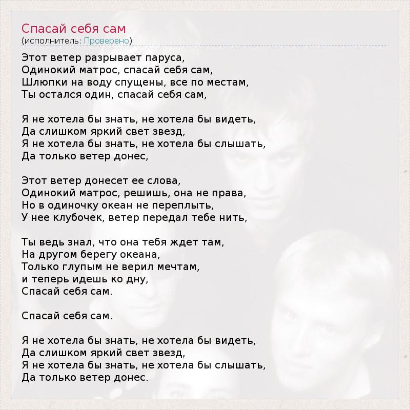 Этот ветер разрывает паруса, Одинокий матрос, спасай себя сам, Шлюпки на воду спущены, все по местам, Ты остался один, спасай себя сам, Я не хотела бы знать, не хотела бы видеть, Да слишком яркий свет звезд, Я не хотела бы знать, не хотела бы слышать, Да только ветер донес, Этот ветер донесет ее слова, Одинокий матрос, решишь, она не права, Но в одиночку океан не переплыть, У нее клубочек, ветер передал тебе нить, Ты ведь знал, что она тебя ждет там, На другом берегу океана, Только глупым не верил мечтам, и теперь идешь ко дну, Спасай себя сам. Спасай себя сам. Я не хотела бы знать, не хотела бы видеть, Да слишком яркий свет звезд, Я не хотела бы знать, не хотела бы слышать, Да только ветер донес.