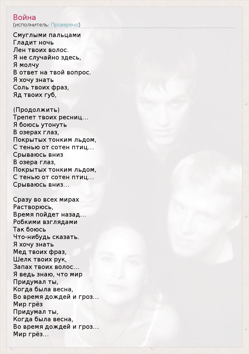 Смуглыми пальцами Гладит ночь Лен твоих волос. Я не случайно здесь, Я молчу В ответ на твой вопрос. Я хочу знать Соль твоих фраз, Яд твоих губ, (Продолжить) Трепет твоих ресниц… Я боюсь утонуть В озерах глаз, Покрытых тонким льдом, С тенью от сотен птиц… Срываюсь вниз В озера глаз, Покрытых тонким льдом, С тенью от сотен птиц… Срываюсь вниз… Сразу во всех мирах Растворюсь, Время пойдет назад… Робкими взглядами Так боюсь Что-нибудь сказать. Я хочу знать Мед твоих фраз, Шелк твоих рук, Запах твоих волос… Я ведь знаю, что мир Придумал ты, Когда была весна, Во время дождей и гроз… Мир грёз Придумал ты, Когда была весна, Во время дождей и гроз… Мир грёз…