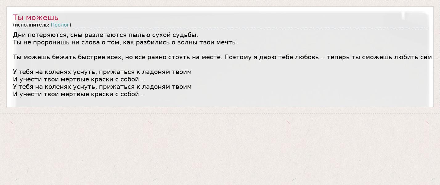 Дни потеряются, сны разлетаются пылью сухой судьбы. Ты не проронишь ни слова о том, как разбились о волны твои мечты. Ты можешь бежать быстрее всех, но все равно стоять на месте. Поэтому я дарю тебе любовь… теперь ты сможешь любить сам… У тебя на коленях уснуть, прижаться к ладоням твоим И унести твои мертвые краски с собой… У тебя на коленях уснуть, прижаться к ладоням твоим И унести твои мертвые краски с собой…