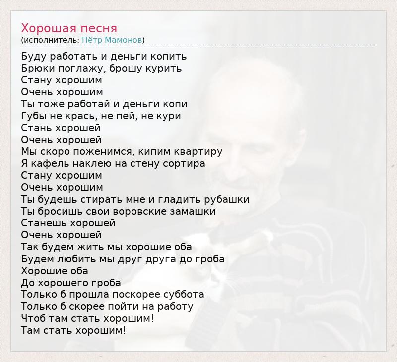 Буду работать и деньги копить Брюки поглажу, брошу курить Стану хорошим Очень хорошим Ты тоже работай и деньги копи Губы не крась, не пей, не кури Стань хорошей Очень хорошей Мы скоро поженимся, кипим квартиру Я кафель наклею на стену сортира Стану хорошим Очень хорошим Ты будешь стирать мне и гладить рубашки Ты бросишь свои воровские замашки Станешь хорошей Очень хорошей Так будем жить мы хорошие оба Будем любить мы друг друга до гроба Хорошие оба До хорошего гроба Только б прошла поскорее суббота Только б скорее пойти на работу Чтоб там стать хорошим! Там стать хорошим!