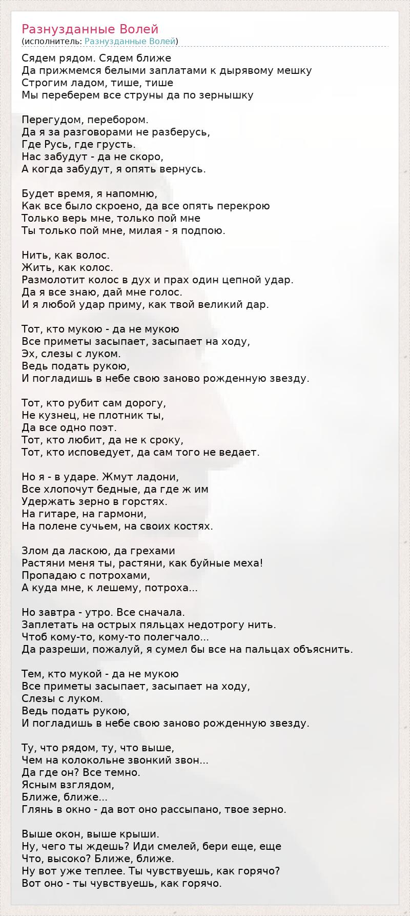 Sit side by side. sit closer Yes Squeeze white patches to the Leaky bag Strict fret , hush, hush We iterate over all the strings on a kernel yes Peregud , overkill. Yes, I will not understand the conversations , Where Russia , where sadness . We forget - but not soon , And when forget , I 'll be back again . Have time, I recall, Everything was tailored , but all again blocked the Just trust me , I only sing You just sing to me , my dear - I signature. Thread as hair. Live like a spike. Grind spike in spirit and dust blow one chain . Yes I know , give me a voice. And I 'll take any shot as your great gift . Whoever flour - so do not torment All signs of falling asleep , falling asleep on the move, Oh, the tears from onions. After apply the hand , And stroke in the sky its newly born star. Anyone who cuts himself road Not a blacksmith , carpenter, not you , Yes, all one poet . Anyone who loves , but not in time , Anyone who professes so that not only knows. But I - in shock. Shake hands , All are busy poor, but where they Keep a handful of grain . Guitar , harmonica , Suchem on logs , on their bones. Evil yes kindness , yes sins I drag you drag as lush fur ! Perishing with giblets , And to me , to the devil , giblets ... But tomorrow - morning. All over again. Braid on sharp hoop touchy thread. To someone , someone feel better ... Yes solvable , perhaps I would be able to explain everything on the fingers . Those who flour - so do not torment All signs of falling asleep , falling asleep on the move, Tears with onions . After apply the hand , And stroke in the sky its newly born star. One that close , the one that is higher Than ringing the bell ringing ... But where is he? All dark . Clear view , Closer, closer ... Look out the window - so here it is scattered , your grain. Above the windows , the roof. Well, what are you waiting for? Go boldly , take more, more That high? Closer, closer . Well here is warmer. You feel hot? That's it - you feel as hot.
