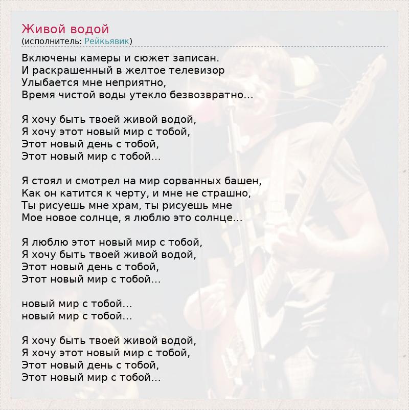 Включены камеры и сюжет записан. И раскрашенный в желтое телевизор Улыбается мне неприятно, Время чистой воды утекло безвозвратно… Я хочу быть твоей живой водой, Я хочу этот новый мир с тобой, Этот новый день с тобой, Этот новый мир с тобой… Я стоял и смотрел на мир сорванных башен, Как он катится к черту, и мне не страшно, Ты рисуешь мне храм, ты рисуешь мне Мое новое солнце, я люблю это солнце… Я люблю этот новый мир с тобой, Я хочу быть твоей живой водой, Этот новый день с тобой, Этот новый мир с тобой… новый мир с тобой… новый мир с тобой… Я хочу быть твоей живой водой, Я хочу этот новый мир с тобой, Этот новый день с тобой, Этот новый мир с тобой…