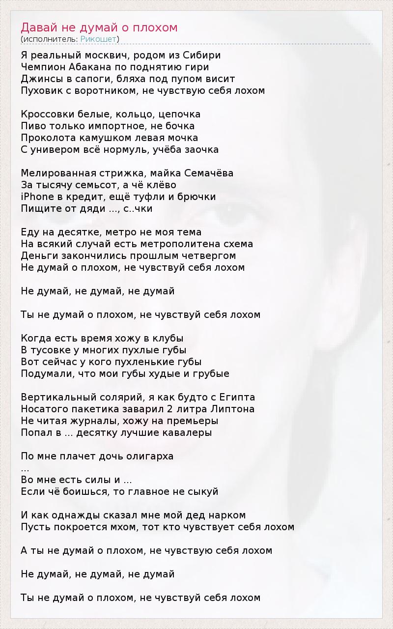 Я реальный москвич, родом из Сибири Чемпион Абакана по поднятию гири Джинсы в сапоги, бляха под пупом висит Пуховик с воротником, не чувствую себя лохом Кроссовки белые, кольцо, цепочка Пиво только импортное, не бочка Проколота камушком левая мочка С универом всё нормуль, учёба заочка Мелированная стрижка, майка Семачёва За тысячу семьсот, а чё клёво iPhone в кредит, ещё туфли и брючки Пищите от дяди ..., с..чки Еду на десятке, метро не моя тема На всякий случай есть метрополитена схема Деньги закончились прошлым четвергом Не думай о плохом, не чувствуй себя лохом Не думай, не думай, не думай Ты не думай о плохом, не чувствуй себя лохом Когда есть время хожу в клубы В тусовке у многих пухлые губы Вот сейчас у кого пухленькие губы Подумали, что мои губы худые и грубые Вертикальный солярий, я как будто с Египта Носатого пакетика заварил 2 литра Липтона Не читая журналы, хожу на премьеры Попал в ... десятку лучшие кавалеры По мне плачет дочь олигарха ... Во мне есть силы и ... Если чё боишься, то главное не сыкуй И как однажды сказал мне мой дед нарком Пусть покроется мхом, тот кто чувствует себя лохом А ты не думай о плохом, не чувствую себя лохом Не думай, не думай, не думай Ты не думай о плохом, не чувствуй себя лохом