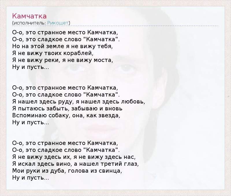 О-o, это странное место Камчатка, О-o, это сладкое слово "Камчатка". Но на этой земле я не вижу тебя, Я не вижу твоих кораблей, Я не вижу реки, я не вижу моста, Ну и пусть... О-o, это странное место Камчатка, О-o, это сладкое слово "Камчатка". Я нашел здесь руду, я нашел здесь любовь, Я пытаюсь забыть, забываю и вновь Вспоминаю собаку, она, как звезда, Ну и пусть... О-o, это странное место Камчатка, О-o, это сладкое слово "Камчатка". Я не вижу здесь их, я не вижу здесь нас, Я искал здесь вино, а нашел третий глаз, Мои руки из дуба, голова из свинца, Ну и пусть...
