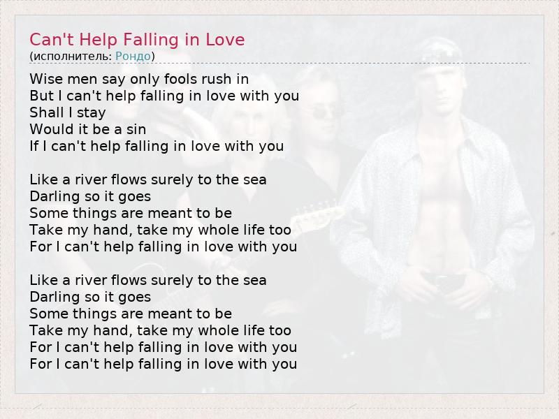 Wise men say only fools rush in But I can't help falling in love with you Shall I stay Would it be a sin If I can't help falling in love with you Like a river flows surely to the sea Darling so it goes Some things are meant to be Take my hand, take my whole life too For I can't help falling in love with you Like a river flows surely to the sea Darling so it goes Some things are meant to be Take my hand, take my whole life too For I can't help falling in love with you For I can't help falling in love with you