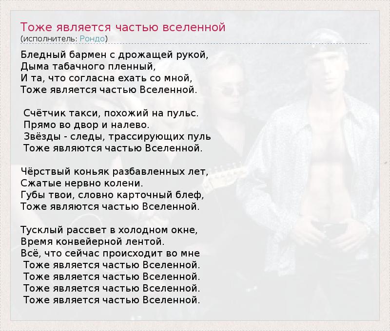 Бледный бармен с дрожащей рукой, Дыма табачного пленный, И та, что согласна ехать со мной, Тоже является частью Вселенной. Счётчик такси, похожий на пульс. Прямо во двор и налево. Звёзды - следы, трассирующих пуль Тоже являются частью Вселенной. Чёрствый коньяк разбавленных лет, Сжатые нервно колени. Губы твои, словно карточный блеф, Тоже являются частью Вселенной. Тусклый рассвет в холодном окне, Время конвейерной лентой. Всё, что сейчас происходит во мне Тоже является частью Вселенной. Тоже является частью Вселенной. Тоже является частью Вселенной. Тоже является частью Вселенной.