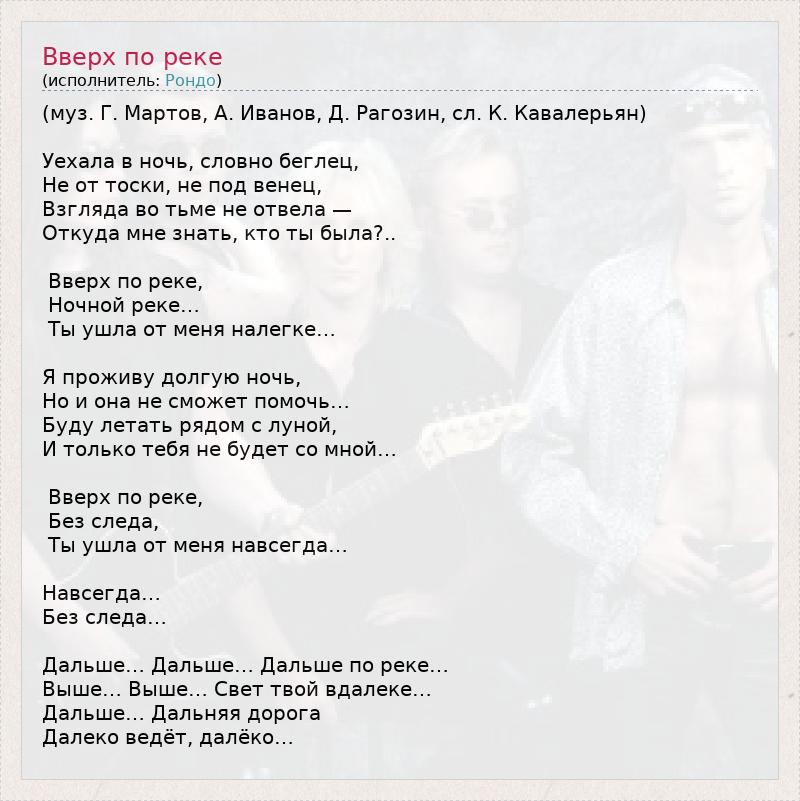 (муз. Г. Мартов, А. Иванов, Д. Рагозин, сл. К. Кавалерьян) Уехала в ночь, словно беглец, Не от тоски, не под венец, Взгляда во тьме не отвела — Откуда мне знать, кто ты была?.. Вверх по реке, Ночной реке… Ты ушла от меня налегке… Я проживу долгую ночь, Но и она не сможет помочь… Буду летать рядом с луной, И только тебя не будет со мной… Вверх по реке, Без следа, Ты ушла от меня навсегда… Навсегда… Без следа… Дальше… Дальше… Дальше по реке… Выше… Выше… Свет твой вдалеке… Дальше… Дальняя дорога Далеко ведёт, далёко…