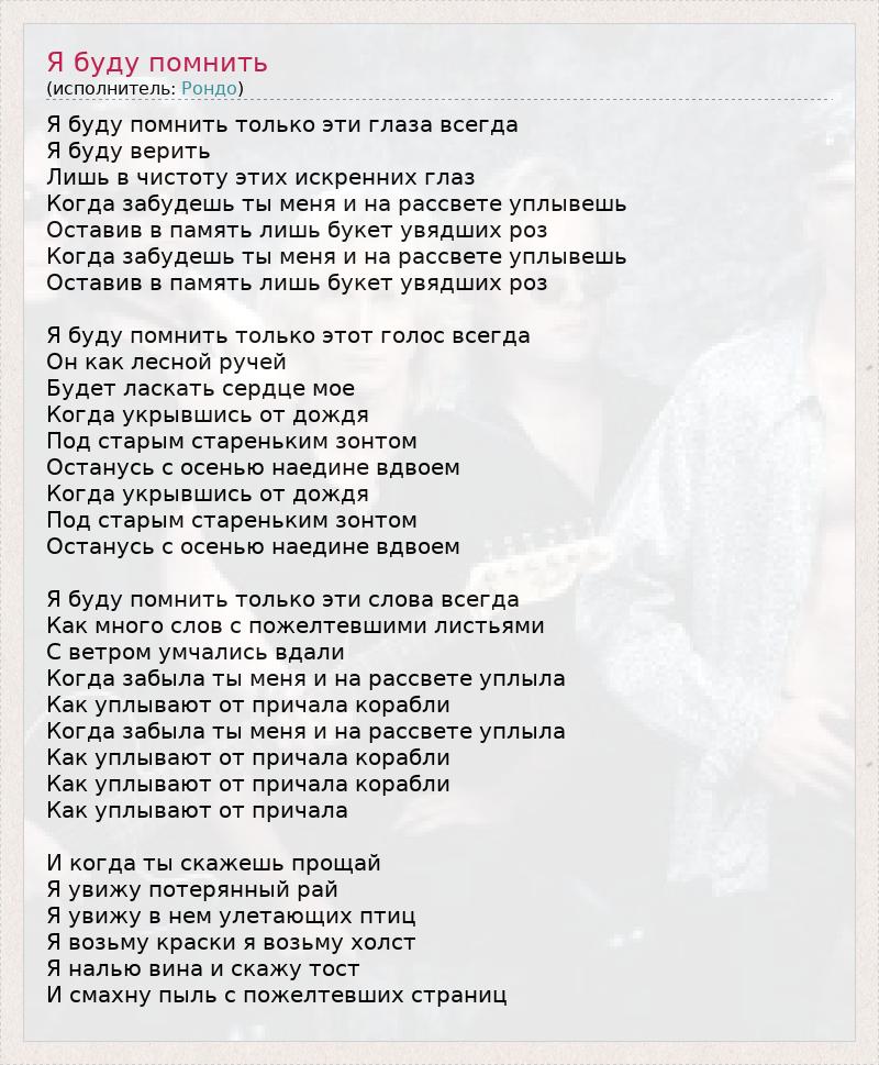 Я буду помнить только эти глаза всегда Я буду верить Лишь в чистоту этих искренних глаз Когда забудешь ты меня и на рассвете уплывешь Оставив в память лишь букет увядших роз Когда забудешь ты меня и на рассвете уплывешь Оставив в память лишь букет увядших роз Я буду помнить только этот голос всегда Он как лесной ручей Будет ласкать сердце мое Когда укрывшись от дождя Под старым стареньким зонтом Останусь с осенью наедине вдвоем Когда укрывшись от дождя Под старым стареньким зонтом Останусь с осенью наедине вдвоем Я буду помнить только эти слова всегда Как много слов с пожелтевшими листьями С ветром умчались вдали Когда забыла ты меня и на рассвете уплыла Как уплывают от причала корабли Когда забыла ты меня и на рассвете уплыла Как уплывают от причала корабли Как уплывают от причала корабли Как уплывают от причала И когда ты скажешь прощай Я увижу потерянный рай Я увижу в нем улетающих птиц Я возьму краски я возьму холст Я налью вина и скажу тост И смахну пыль с пожелтевших страниц