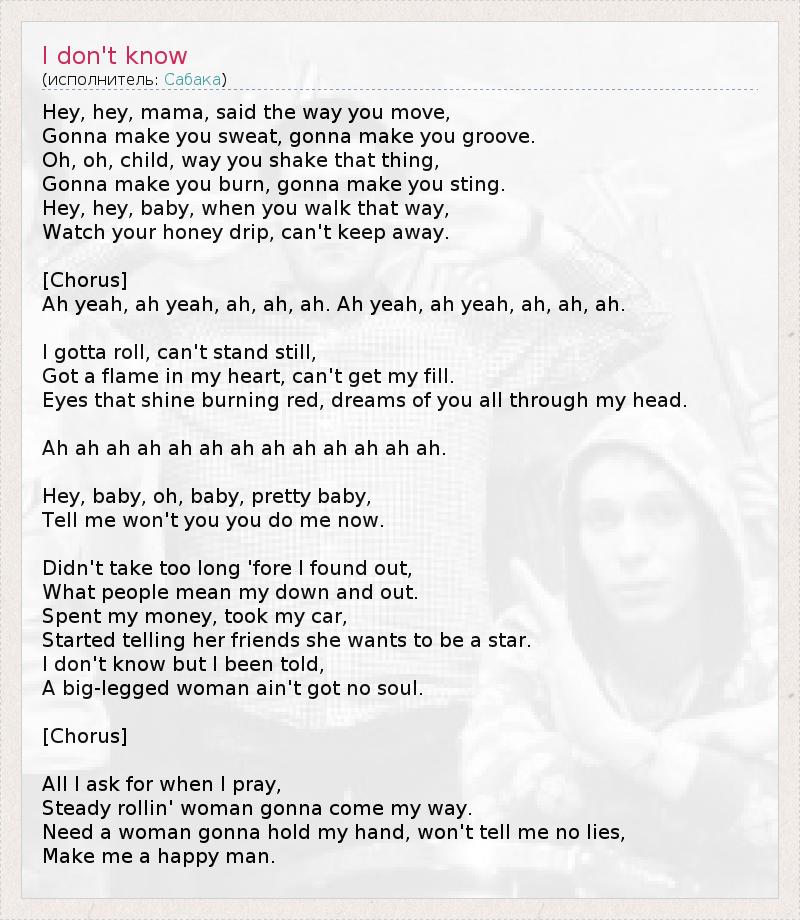 Э-эй, красотка, ты так зажигаешь - Я заставлю тебя взмокнуть, ты будешь довольна как никогда... О, о, детка, ты так трясешь ею - Ты вся будешь гореть, внутри всё будет жечь... Э-эй, малышка, ты проходишь мимо, Из тебя каплет мед,- мне не устоять на месте... [Припев:] О, да! О, да! О, о, о... О, да! О, да! О, о, о... Срываюсь с места - ну как здесь устоять: Мое сердце объято пламенем, мне нужно утолить этот голод, Глаза горят, в голове - только мысли о тебе.... О, о, о, о, о, о, о, о... Эй, детка! О, детка, милая детка, Объясни - отчего бы нам не начать прямо сейчас?.. ...Не так уж много времени мне потребовалось, Чтобы понять, что значит "остаться в дураках": Потратила все мои деньги, забрала ключи от машины И теперь рассказывает всем, что, мол, хочет стать звездой! Не знаю, так ли это, но помню, что мне говорили: У красивых женщин не бывает сердца. [Припев] Все, чего я прошу в своих молитвах - Встретить женщину, которая подошла бы мне; А нужна мне женщина, которая не станет мне лгать, Которая просто возьмет меня за руку - и сделает меня счастливым.