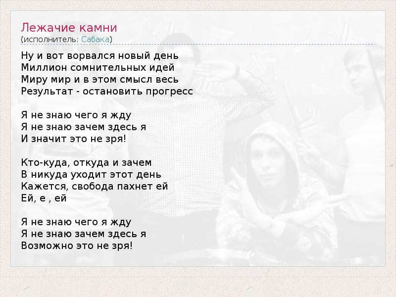 Ну и вот ворвался новый день Миллион сомнительных идей Миру мир и в этом смысл весь Результат - остановить прогресс Я не знаю чего я жду Я не знаю зачем здесь я И значит это не зря! Кто-куда, откуда и зачем В никуда уходит этот день Кажется, свобода пахнет ей Ей, е , ей Я не знаю чего я жду Я не знаю зачем здесь я Возможно это не зря!
