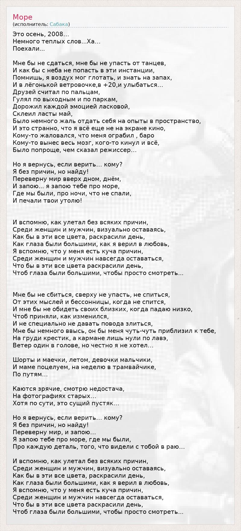 Это осень, 2008… Немного теплых слов...Ха… Поехали... Мне бы не сдаться, мне бы не упасть от танцев, И как бы с неба не попасть в эти инстанции, Помнишь, я воздух мог глотать, и знать на запах, И в лёгонькой ветровочке,в +20,и улыбаться… Друзей считал по пальцам, Гулял по выходным и по паркам, Дорожил каждой эмоцией ласковой, Склеил ласты май, Было немного жаль отдать себя на опыты в пространство, И это странно, что я всё еще не на экране кино, Кому-то жаловался, что меня ограбил , баро Кому-то вынес весь мозг, кого-то кинул и всё, Было попроще, чем сказал режиссер… Но я вернусь, если верить… кому? Я без причин, но найду! Переверну мир вверх дном, днём, И запою... я запою тебе про море, Где мы были, про ночи, что не спали, И печали твои утолю! И вспомню, как улетал без всяких причин, Среди женщин и мужчин, визуально оставаясь, Как бы в эти все цвета, раскрасили день, Как глаза были большими, как я верил в любовь, Я вспомню, что у меня есть куча причин, Среди женщин и мужчин навсегда оставаться, Что бы в эти все цвета раскрасили день, Чтоб глаза были большими, чтобы просто смотреть... Мне бы не сбиться, сверху не упасть, не спиться, От этих мыслей и бессонницы, когда не спится, И мне бы не обидеть своих близких, когда падаю низко, Чтоб приняли, как изменился, И не специально не давать повода злиться, Мне бы немного ввысь, он бы меня чуть-чуть приблизил к тебе, На груди крестик, а кармане лишь нули по лавэ, Ветер один в голове, но честно я не хотел… Шорты и маечки, летом, девочки мальчики, И маме поцелуем, на неделю в трамвайчике, По путям… Каются зрячие, смотрю недостача, На фотографиях старых… Хотя по сути, это сущий пустяк… Но я вернусь, если верить… кому? Я без причин, но найду! Переверну мир, и запою… Я запою тебе про море, где мы были, Про каждую деталь, того, что видели с тобой в раю… И вспомню, как улетал без всяких причин, Среди женщин и мужчин, визуально оставаясь, Как бы в эти все цвета, раскрасили день, Как глаза были большими, как я верил в любовь, Я вспомню, что у меня есть куча причин, Среди женщин и мужчин навсегда оставаться, Что бы в эти все цвета раскрасили день, Чтоб глаза были большими, чтобы просто смотреть...