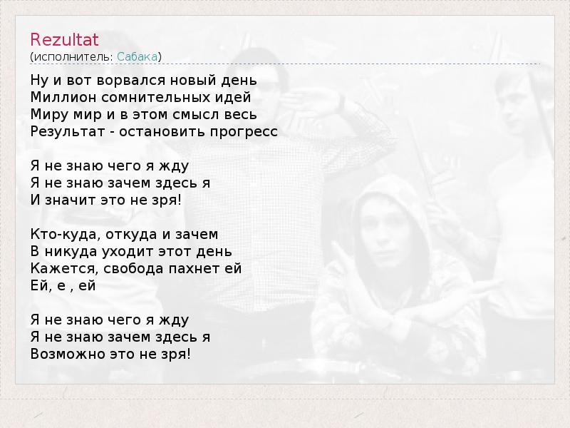 Ну и вот ворвался новый день Миллион сомнительных идей Миру мир и в этом смысл весь Результат - остановить прогресс Я не знаю чего я жду Я не знаю зачем здесь я И значит это не зря! Кто-куда, откуда и зачем В никуда уходит этот день Кажется, свобода пахнет ей Ей, е , ей Я не знаю чего я жду Я не знаю зачем здесь я Возможно это не зря!