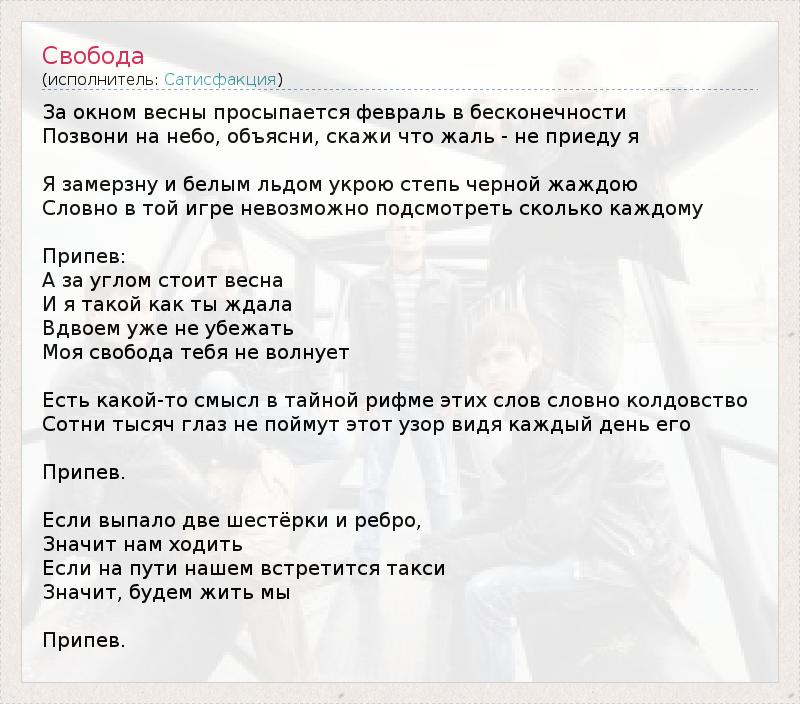 За окном весны просыпается февраль в бесконечности Позвони на небо, объясни, скажи что жаль - не приеду я Я замерзну и белым льдом укрою степь черной жаждою Словно в той игре невозможно подсмотреть сколько каждому Припев: А за углом стоит весна И я такой как ты ждала Вдвоем уже не убежать Моя свобода тебя не волнует Есть какой-то смысл в тайной рифме этих слов словно колдовство Сотни тысяч глаз не поймут этот узор видя каждый день его Припев. Если выпало две шестёрки и ребро, Значит нам ходить Если на пути нашем встретится такси Значит, будем жить мы Припев.