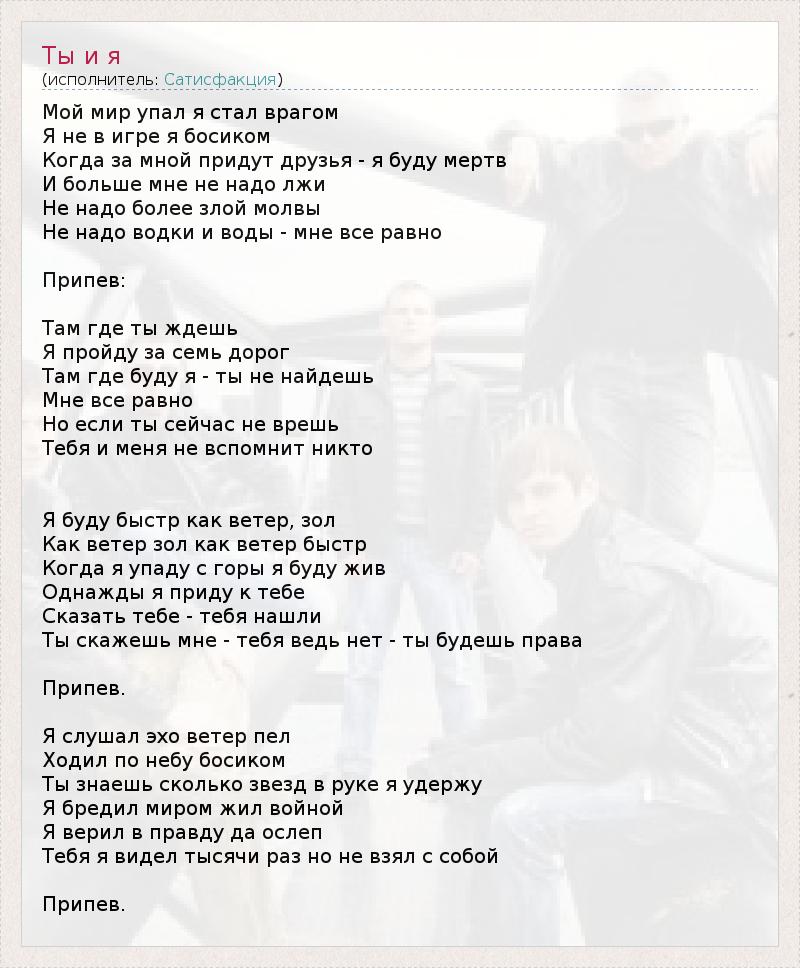 Мой мир упал я стал врагом Я не в игре я босиком Когда за мной придут друзья - я буду мертв И больше мне не надо лжи Не надо более злой молвы Не надо водки и воды - мне все равно Припев: Там где ты ждешь Я пройду за семь дорог Там где буду я - ты не найдешь Мне все равно Но если ты сейчас не врешь Тебя и меня не вспомнит никто Я буду быстр как ветер, зол Как ветер зол как ветер быстр Когда я упаду с горы я буду жив Однажды я приду к тебе Сказать тебе - тебя нашли Ты скажешь мне - тебя ведь нет - ты будешь права Припев. Я слушал эхо ветер пел Ходил по небу босиком Ты знаешь сколько звезд в руке я удержу Я бредил миром жил войной Я верил в правду да ослеп Тебя я видел тысячи раз но не взял с собой Припев.
