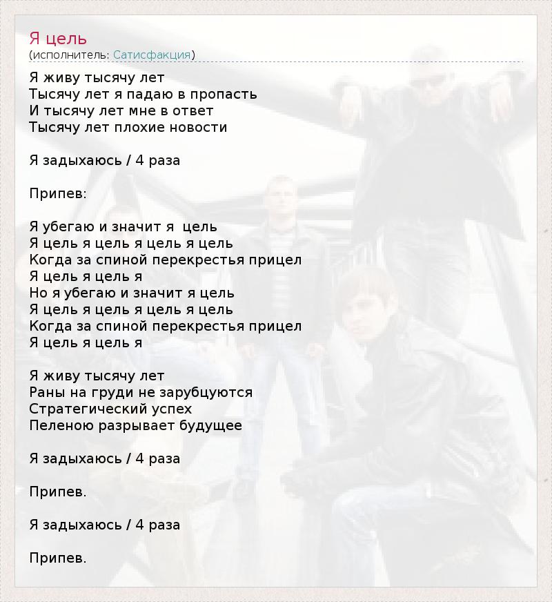 Я живу тысячу лет Тысячу лет я падаю в пропасть И тысячу лет мне в ответ Тысячу лет плохие новости Я задыхаюсь / 4 раза Припев: Я убегаю и значит я цель Я цель я цель я цель я цель Когда за спиной перекрестья прицел Я цель я цель я Но я убегаю и значит я цель Я цель я цель я цель я цель Когда за спиной перекрестья прицел Я цель я цель я Я живу тысячу лет Раны на груди не зарубцуются Стратегический успех Пеленою разрывает будущее Я задыхаюсь / 4 раза Припев. Я задыхаюсь / 4 раза Припев.