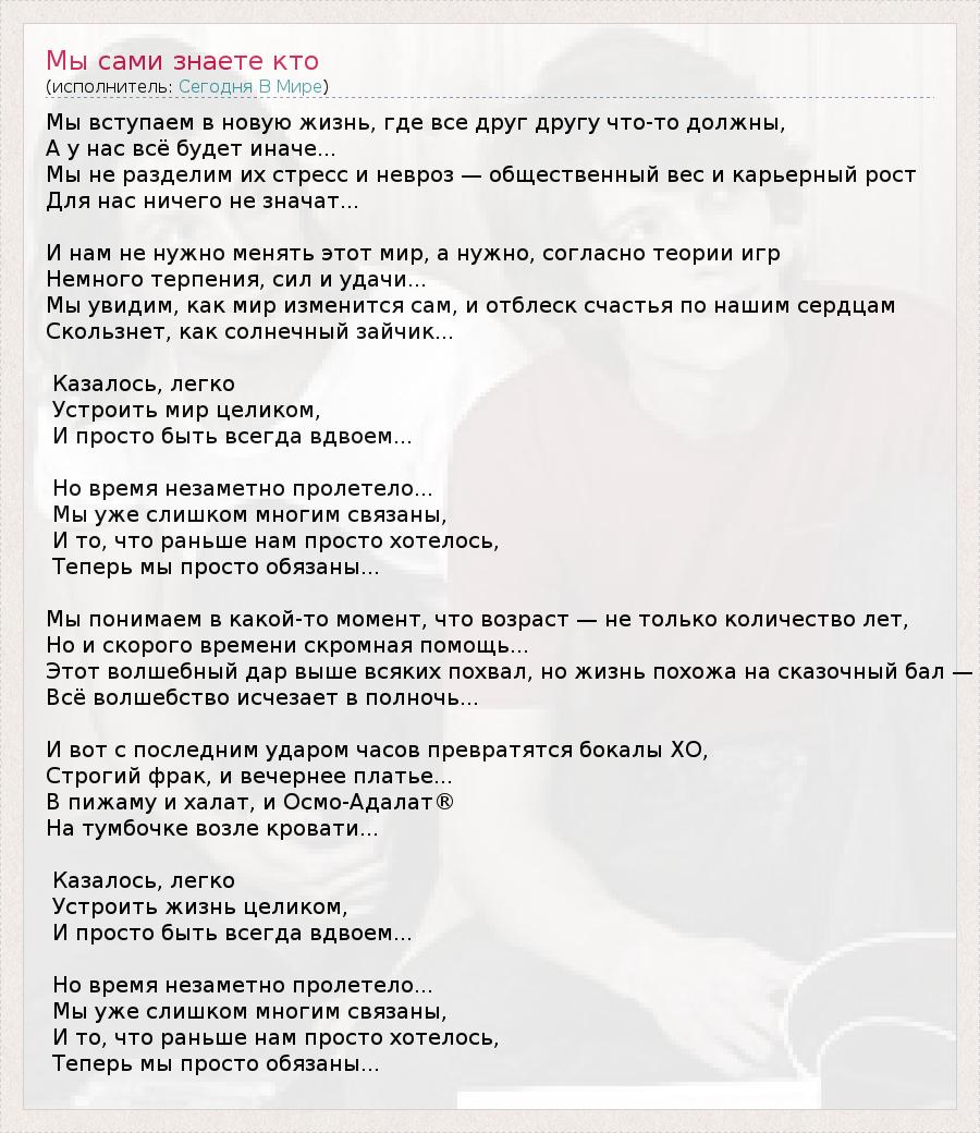Мы вступаем в новую жизнь, где все друг другу что-то должны, А у нас всё будет иначе... Мы не разделим их стресс и невроз — общественный вес и карьерный рост Для нас ничего не значат... И нам не нужно менять этот мир, а нужно, согласно теории игр Немного терпения, сил и удачи... Мы увидим, как мир изменится сам, и отблеск счастья по нашим сердцам Скользнет, как солнечный зайчик... Казалось, легко Устроить мир целиком, И просто быть всегда вдвоем... Но время незаметно пролетело... Мы уже слишком многим связаны, И то, что раньше нам просто хотелось, Теперь мы просто обязаны... Мы понимаем в какой-то момент, что возраст — не только количество лет, Но и скорого времени скромная помощь... Этот волшебный дар выше всяких похвал, но жизнь похожа на сказочный бал — Всё волшебство исчезает в полночь... И вот с последним ударом часов превратятся бокалы XO, Строгий фрак, и вечернее платье... В пижаму и халат, и Осмо-Адалат® На тумбочке возле кровати... Казалось, легко Устроить жизнь целиком, И просто быть всегда вдвоем... Но время незаметно пролетело... Мы уже слишком многим связаны, И то, что раньше нам просто хотелось, Теперь мы просто обязаны...